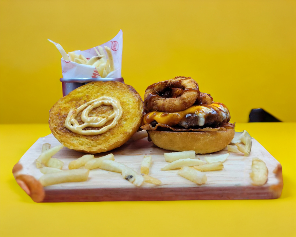 Pan brioche, 200gr de sirloin, aros de cebolla, queso amarillo y queso manchego, bbq magma. Acompañada de Papas a la francesa.