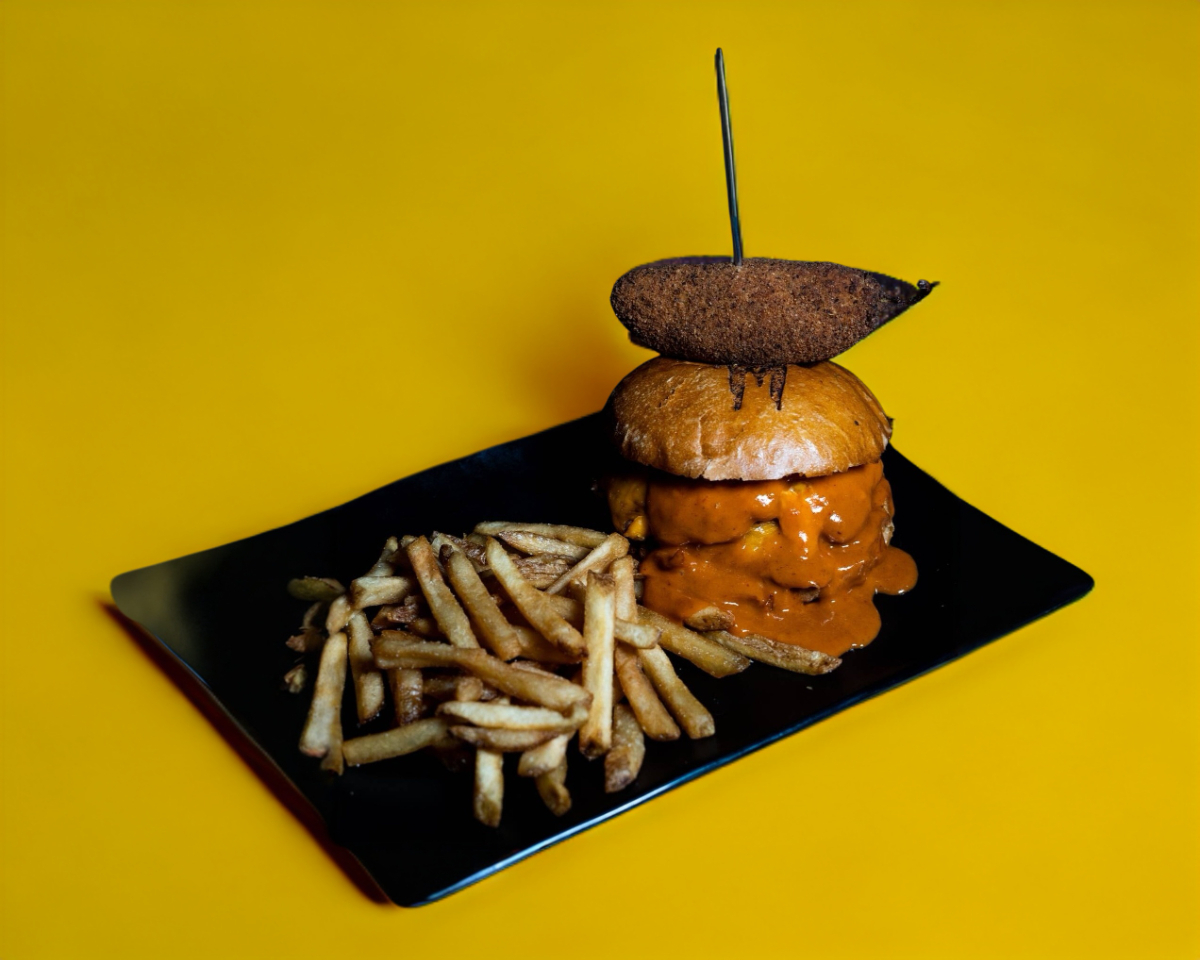 Pan brioche, 2 porciones de 100 gramos de sirloin, lava BBQ, tocino, magma mayo especial de la casa y jalapeño popper, acompañada de papas a la francesa.
