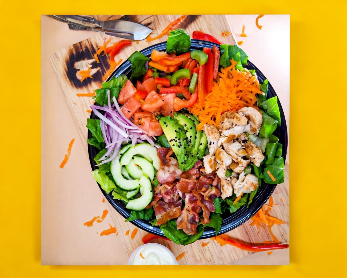 Base de lechuga, acompañada de tomate, pepino, zanahoria rayada, cebolla morada, mix de pimientos, aguacate, pollo a la planca y tocino krispy.