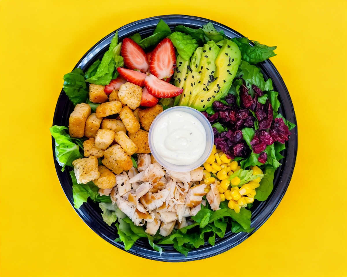 Base de lechuga, acompañdado de elotitos, arandanos, aguacate, fresas, croutones y Pollo a la Plancha.