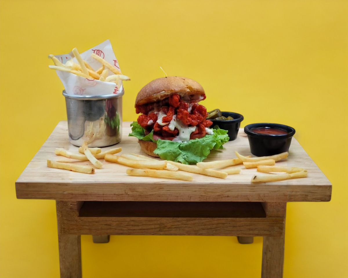 Pan brioche, 150 gr. de boneless con salsa a elegir, aderezo ranch, tomate y lechuga fritz. acom´pañada de papas a la francesa.