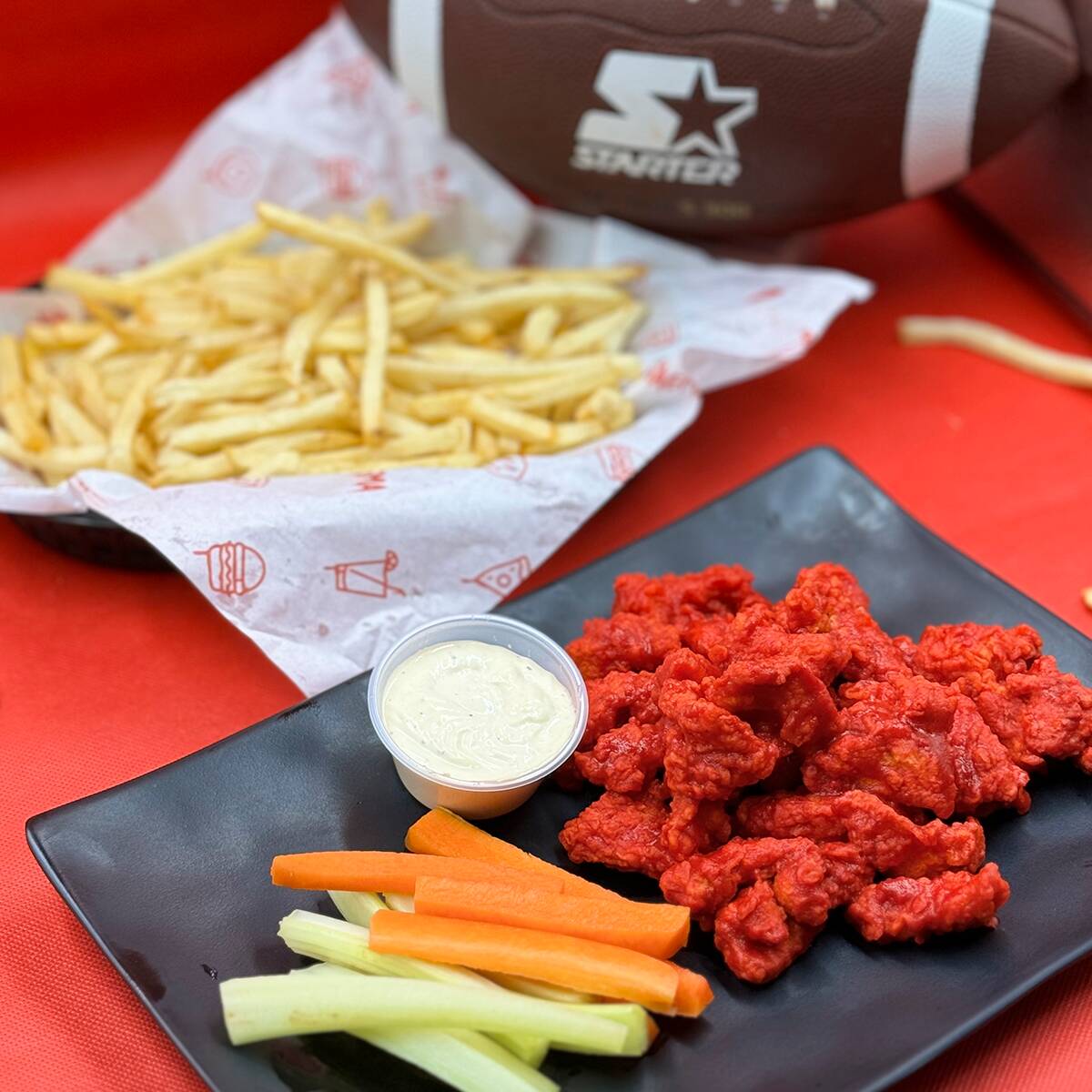 300 gr. de Tiras de Pollo sin hueso, empanizadas en panko. (bañadas en una salsa especial a elegir), acompañadas de bastones de Apio y Zanahoria y Aderezo Ranch.