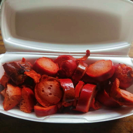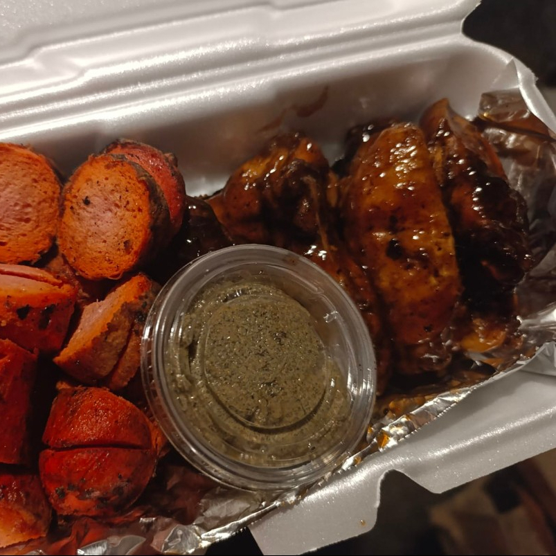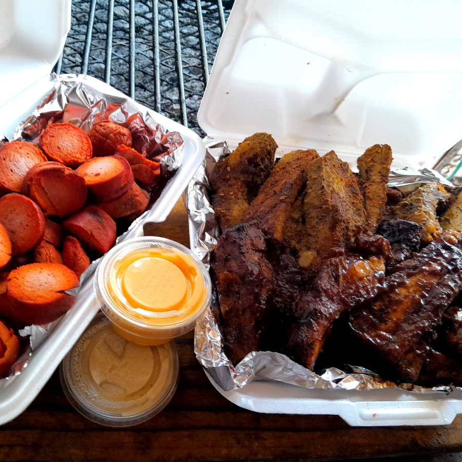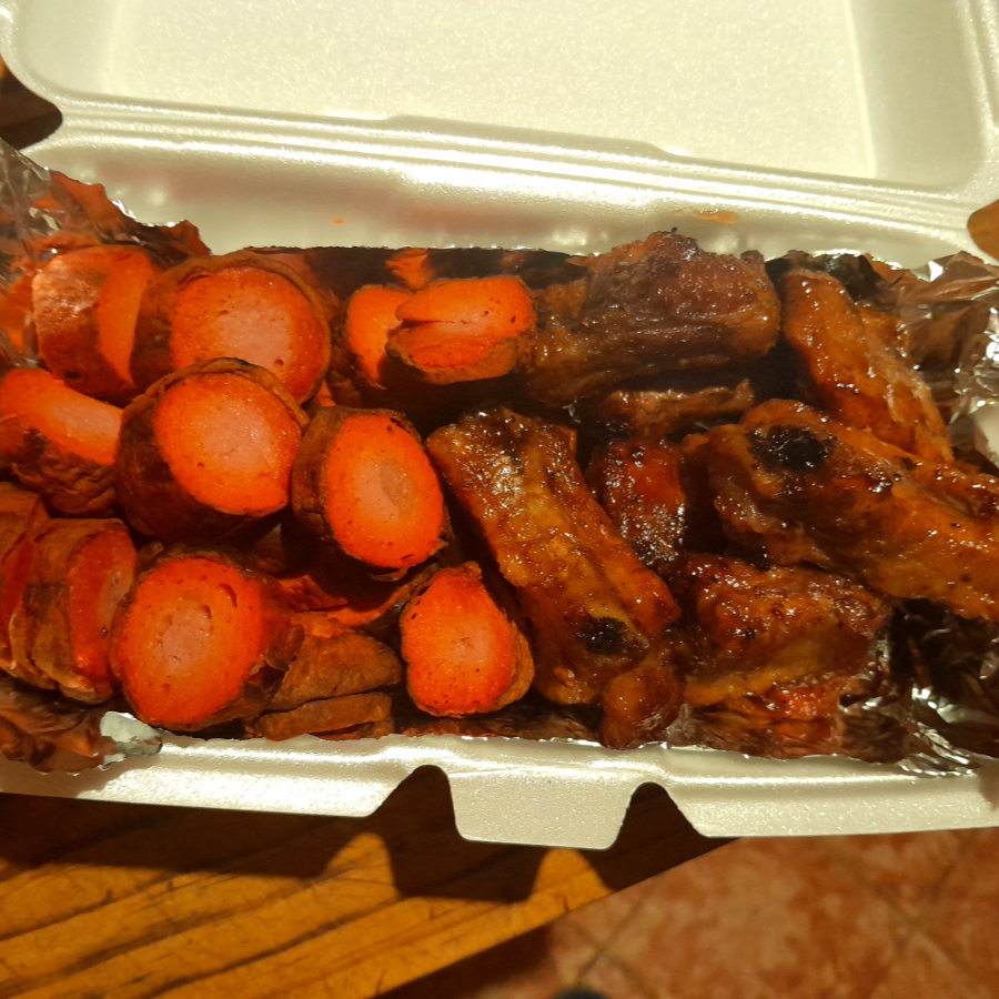 1 kilo de costillas asadas en la salsa de su elección, acompañado de salchichas asadas y aderezos