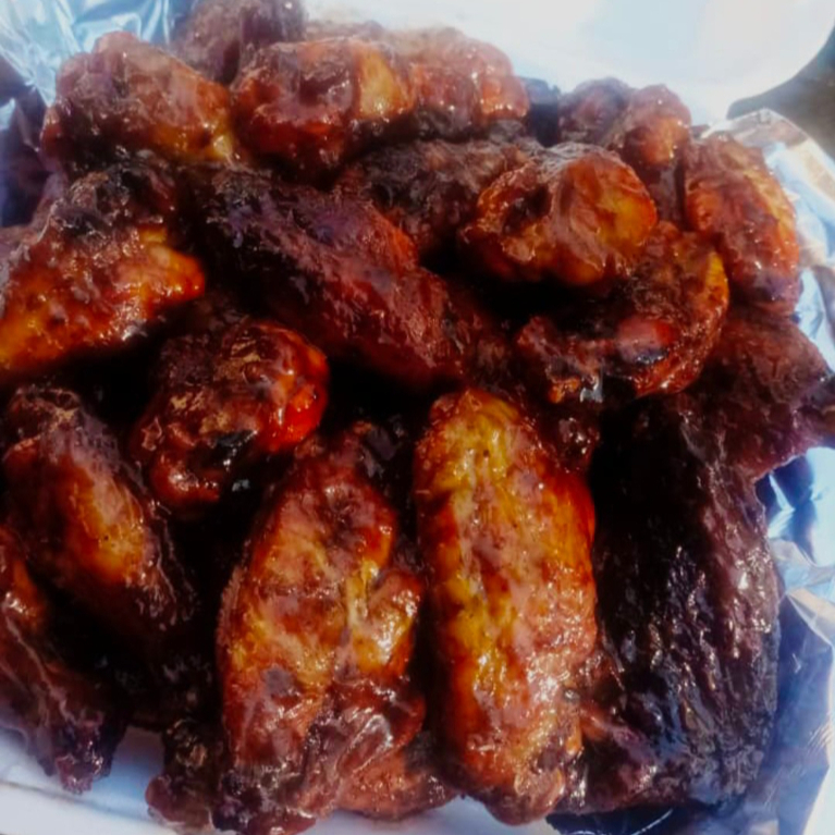 Orden de 35 alitas en el sabor de su elección, acompañadas de salchichas asadas y aderezos