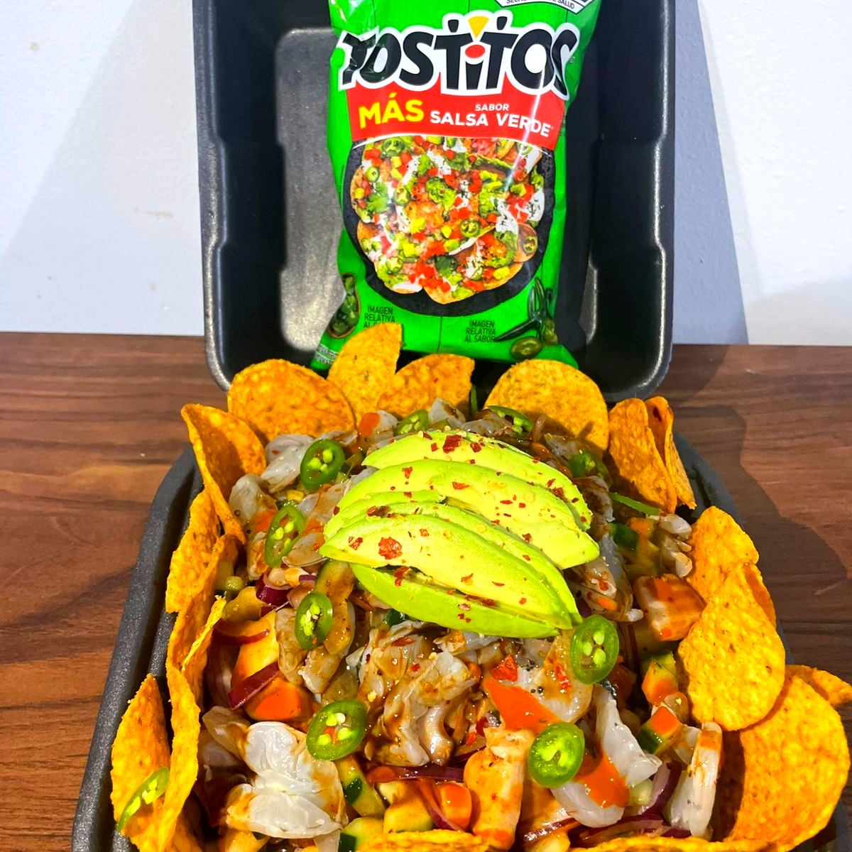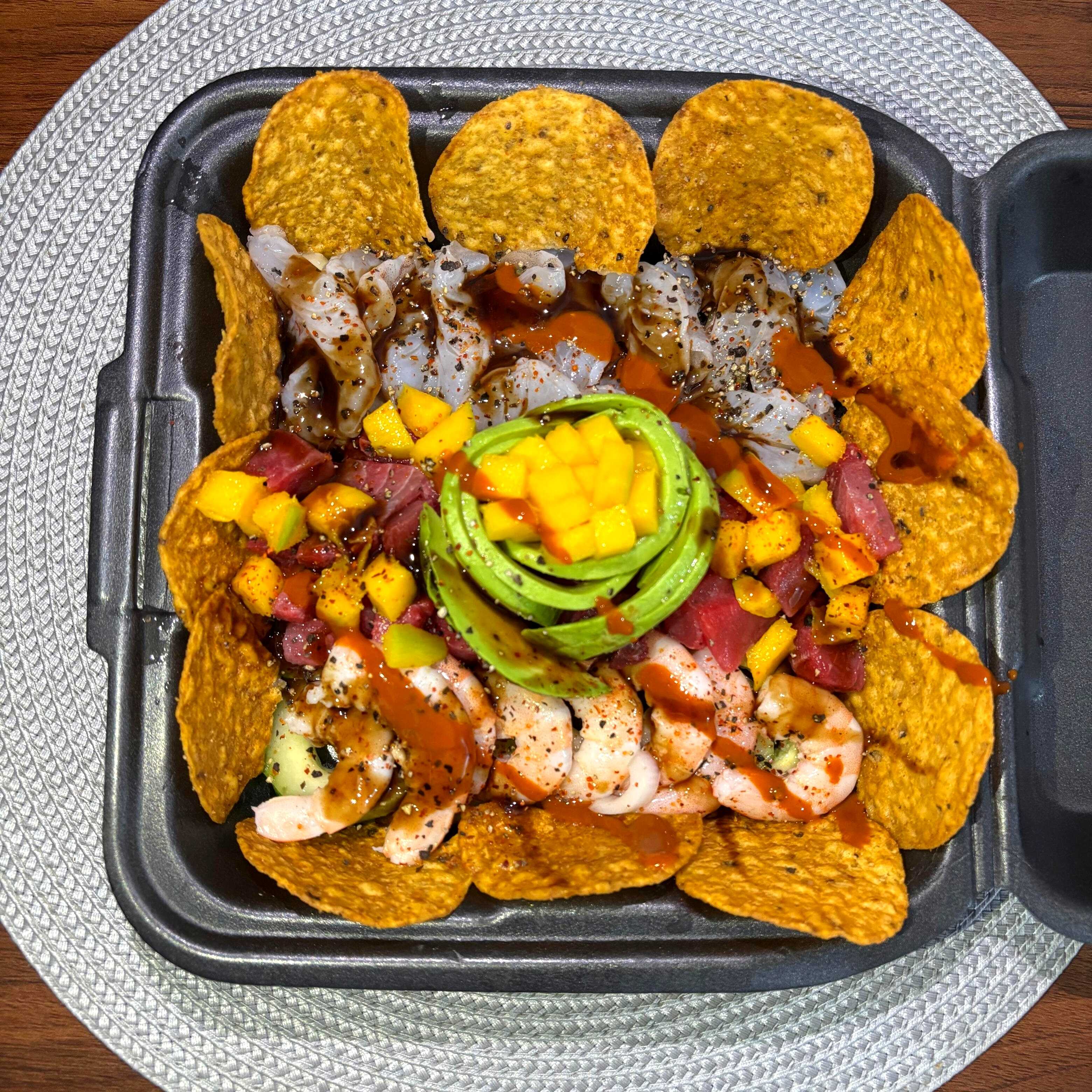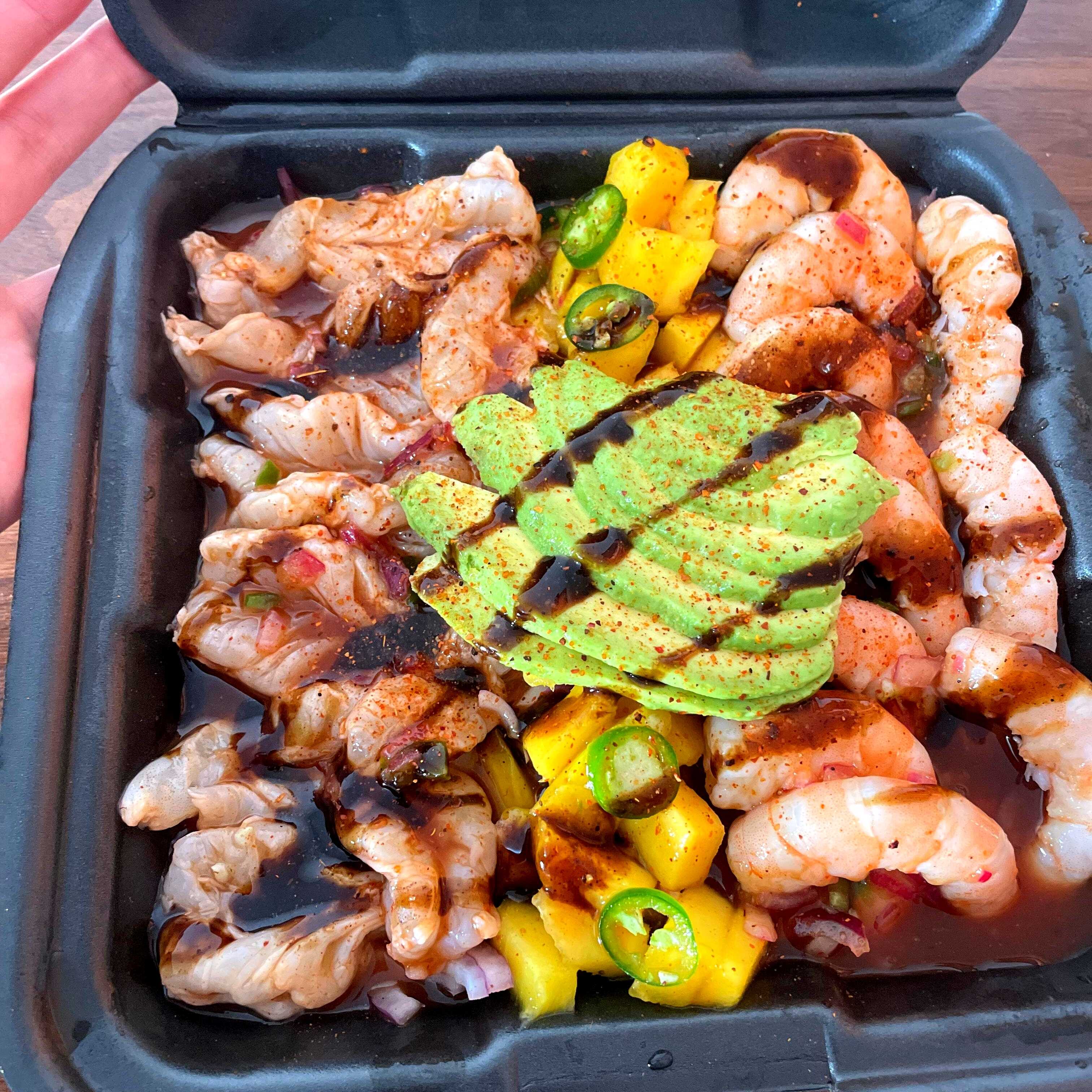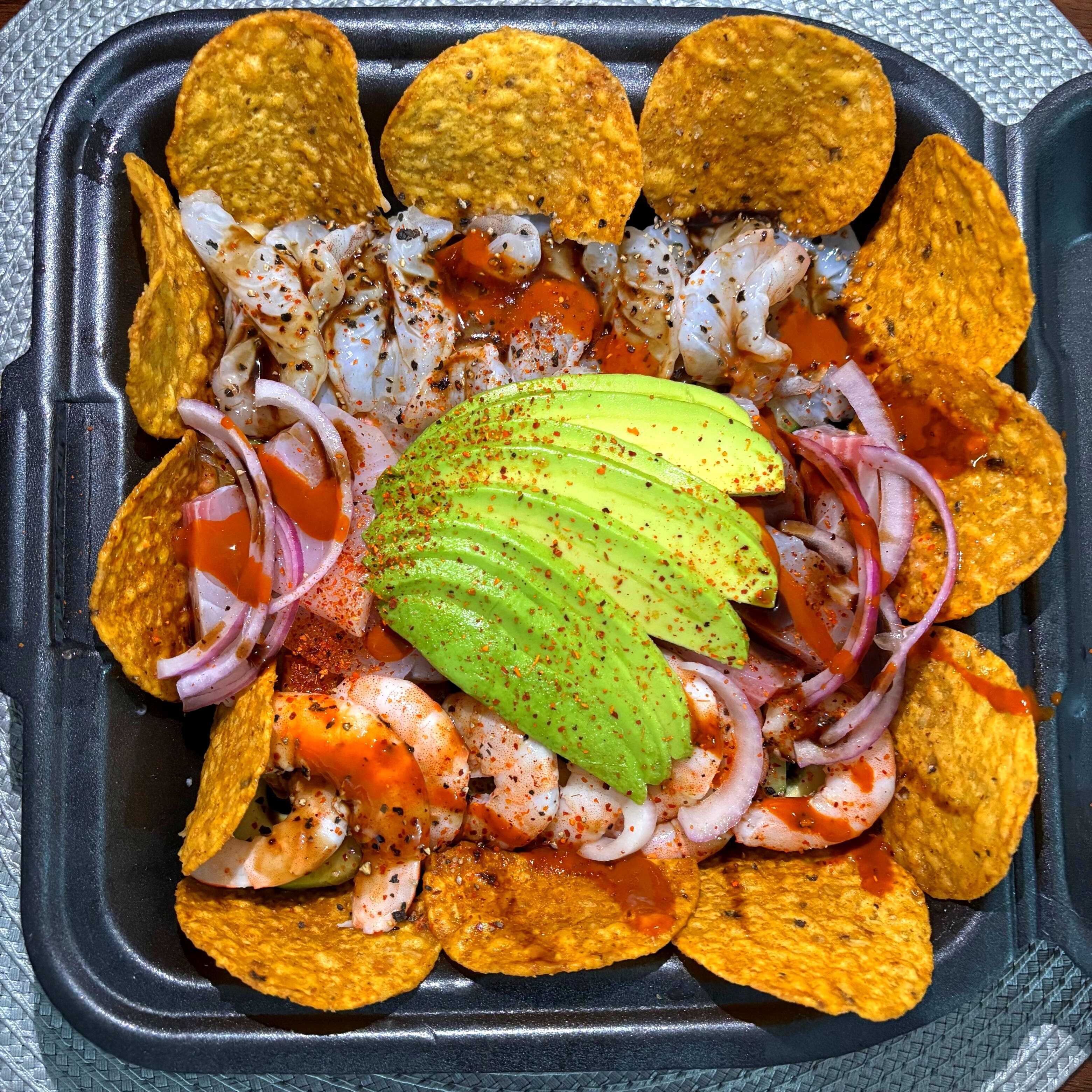 1.5-2 personas-Camarón cocido y curtido, medallon de atún, mango, pepino, cebolla sus respectivas especias naturales molcajeteadas al momento y salseado.-acompañado con tostitos