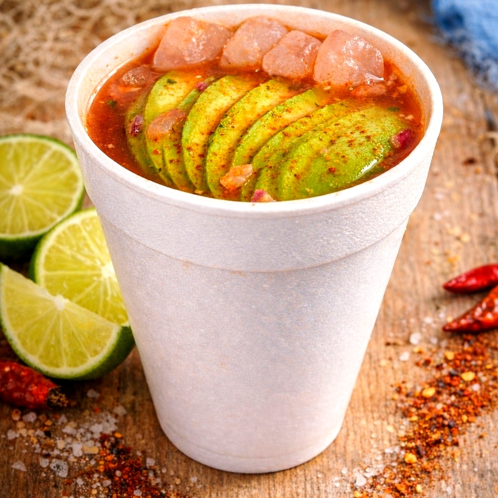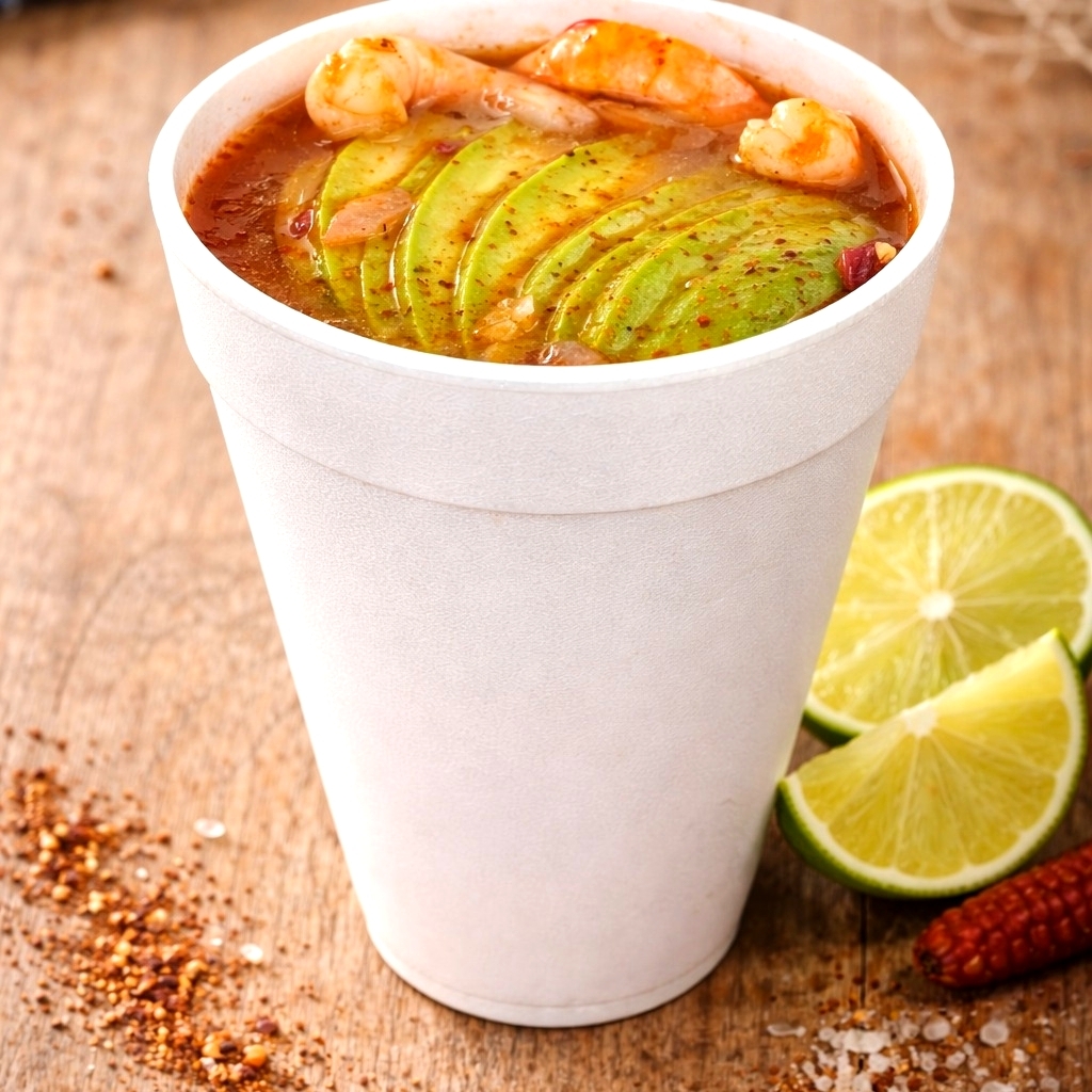 1.5-2 personas-Camarón cocido, callitos, camarón curtido, pepino, cebolla,sus respectivas especias naturales molcajeteadas al momento y salseado de la casa