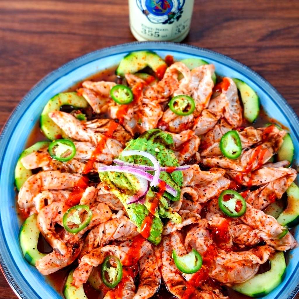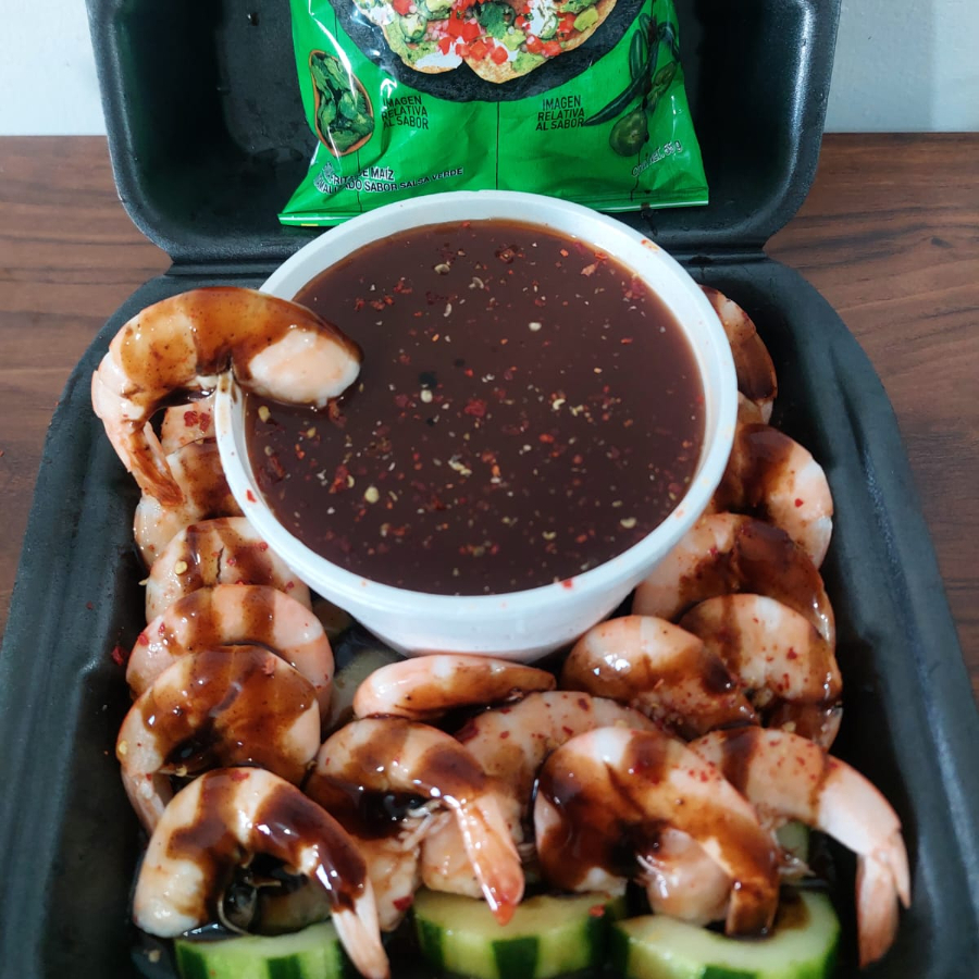 CAMARON P/PELAR BAÑADO EN SALSA DE LA CASA, CAMA DE PEPINO, CLAMATO SALSEADO ACOMPAÑADO DE TOSTITOS