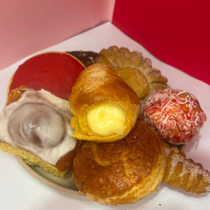 charola con 10 piezas de pan, 5 de reposteria y 5 de dulce, piezas variadas