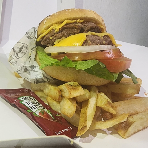 Lechuga, tomate, cebolla, carne, doble queso y aderezo de la casa
