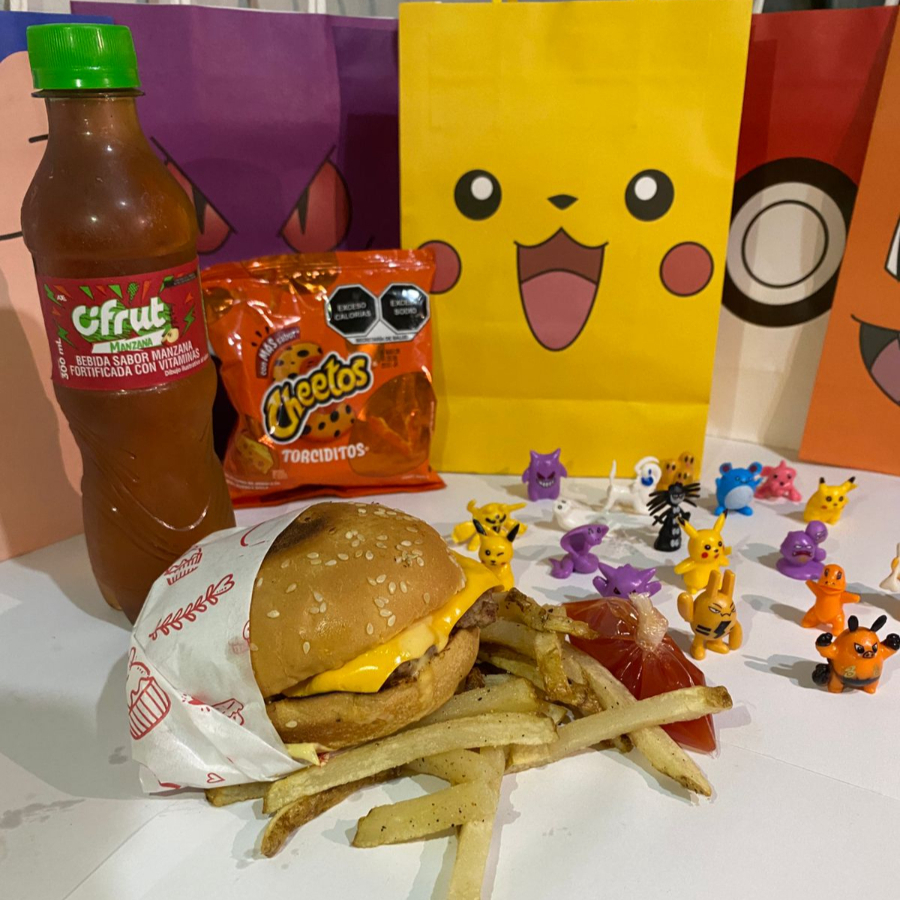 Hamburguesa De Queso, Papas, Sabritas, Jugo y 3 Pokemon Al Azar