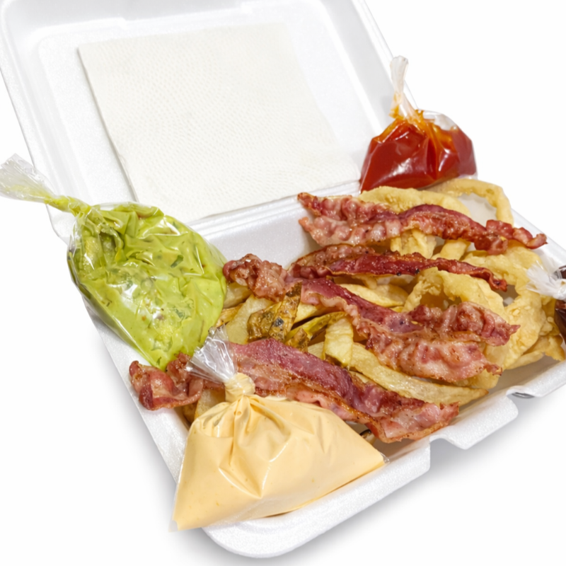 Charola Mitad Papas, Mitad Aros de cebolla con tocino y de acompañamiento, Guacamole, aderezo de la casa, capsu, y BBQ