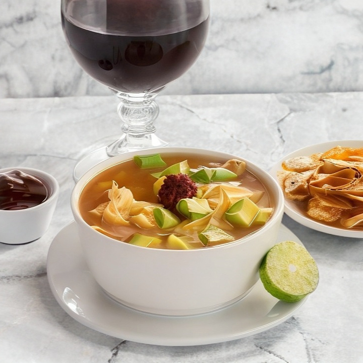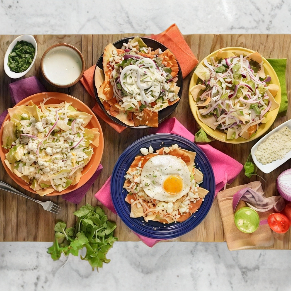 Tortillas, chile, salsa ranchera, queso gratinado, cebolla morada, cilantro