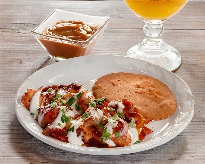 ( SALSA DE MOLE, QUESO GRATINADO CON CREMA ACOMPAÑADO DE FRIJOL)