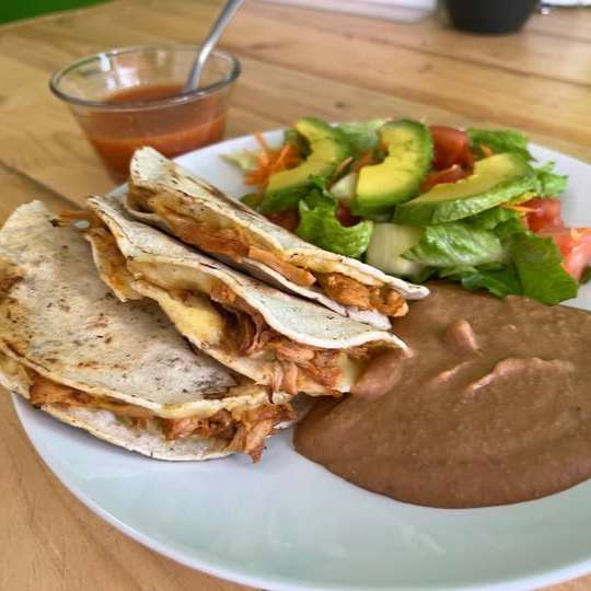 ( 3PZAS. QUESADILLA DE HARINA O MAIZ RELLENAS DE MACHACA CON VERDURA, ACOMPAÑADAS DE ENSALADA Y FRIJOL )