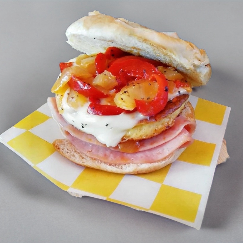 Una tortita de huevo revuelto cocinada sin aceite acompañada de queso manchego fundido, rebanada de jamón ó tocino, cebolla y morrón rojo caramelizados dentro de un delicioso croissant.