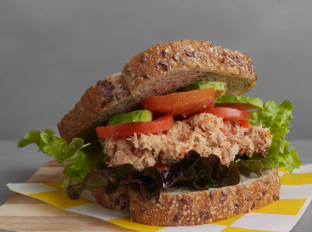 Nuestro atún en agua preparado con el aderezo de la casa Dijón-Chipotle y morrón rojo fresco, tomate, aguacate y lechuga san gría en pan de barra multigrano linaza, opción de pedir el pan dorado o sin dorar.