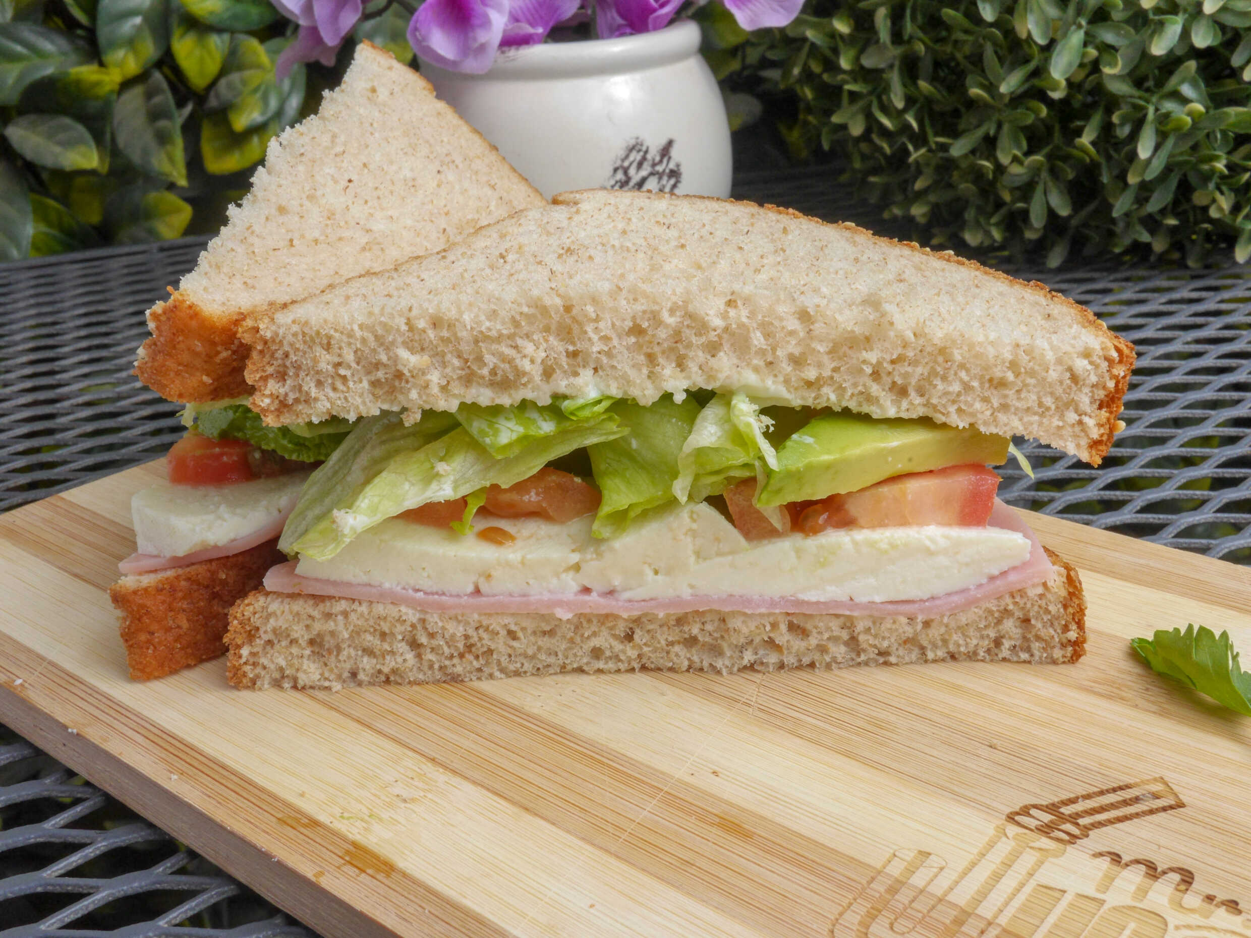 Sándwich básico de jamón, panela, aguacate, tomate y lechuga servido dentro de pan de barra integral con opción de pedirlo con el pan dorado o sin dorar.