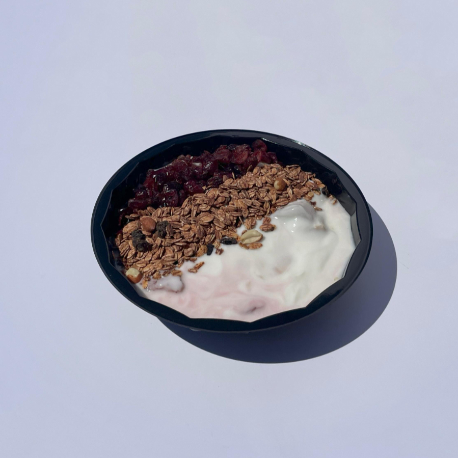 Bowl de fruta fresca (mango, fresa, melón, uva, manzana y pera) con yogur natural complementado con arándanos, miel y granola.