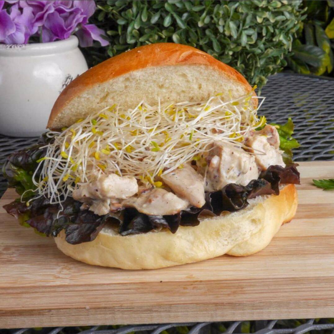 Ensalada de pechuga de pollo a la parrilla con un cremoso aderezo con chabacano y almendras tostadas, una base de lechuga sangria y germinado de alfalfa en un excelente croissant.