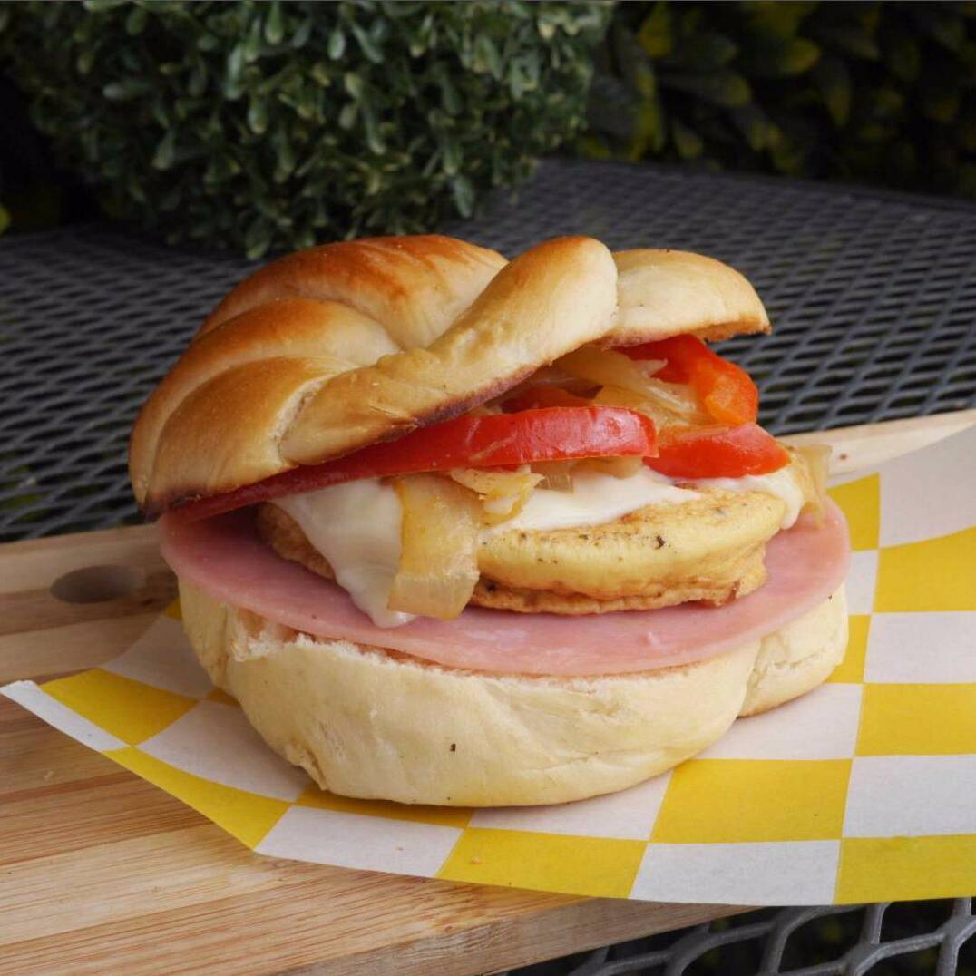 Tortita de huevo cocinada sin aceite con queso manchego gratinado, rebanada de jamón, cebolla y morrón rojo caramelizados en un delicioso croissant.
