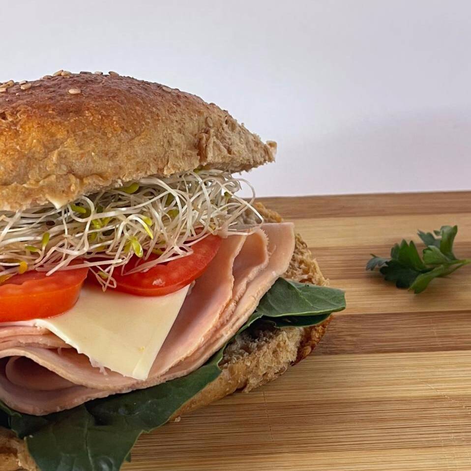 100% Pechuga de pavo natural, germinado de alfalfa, espinaca, tomate y queso manchego y pan a su eleccion.