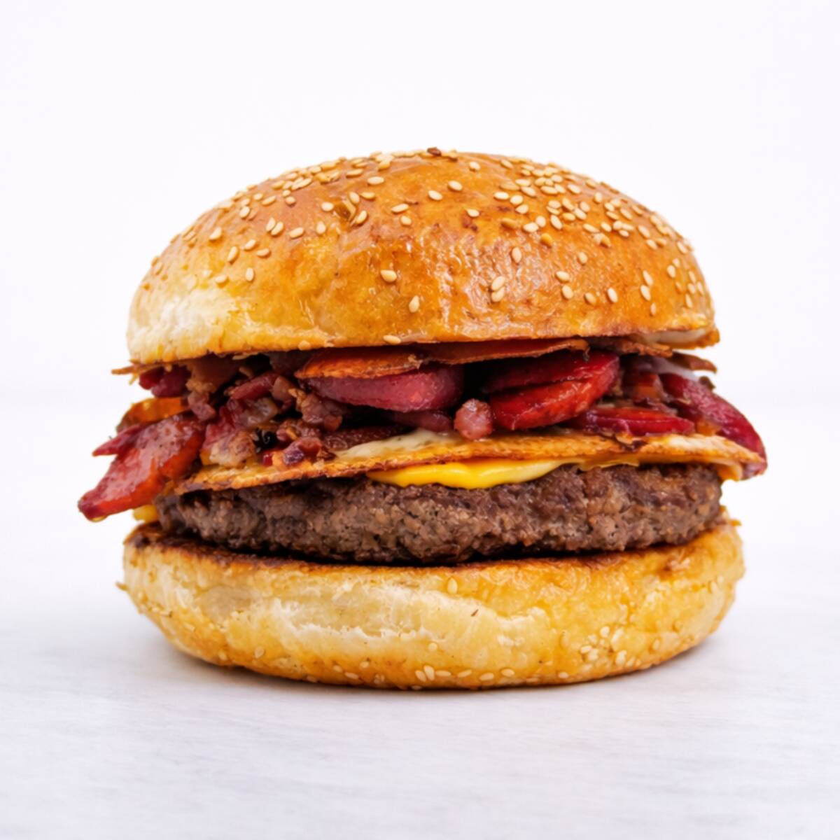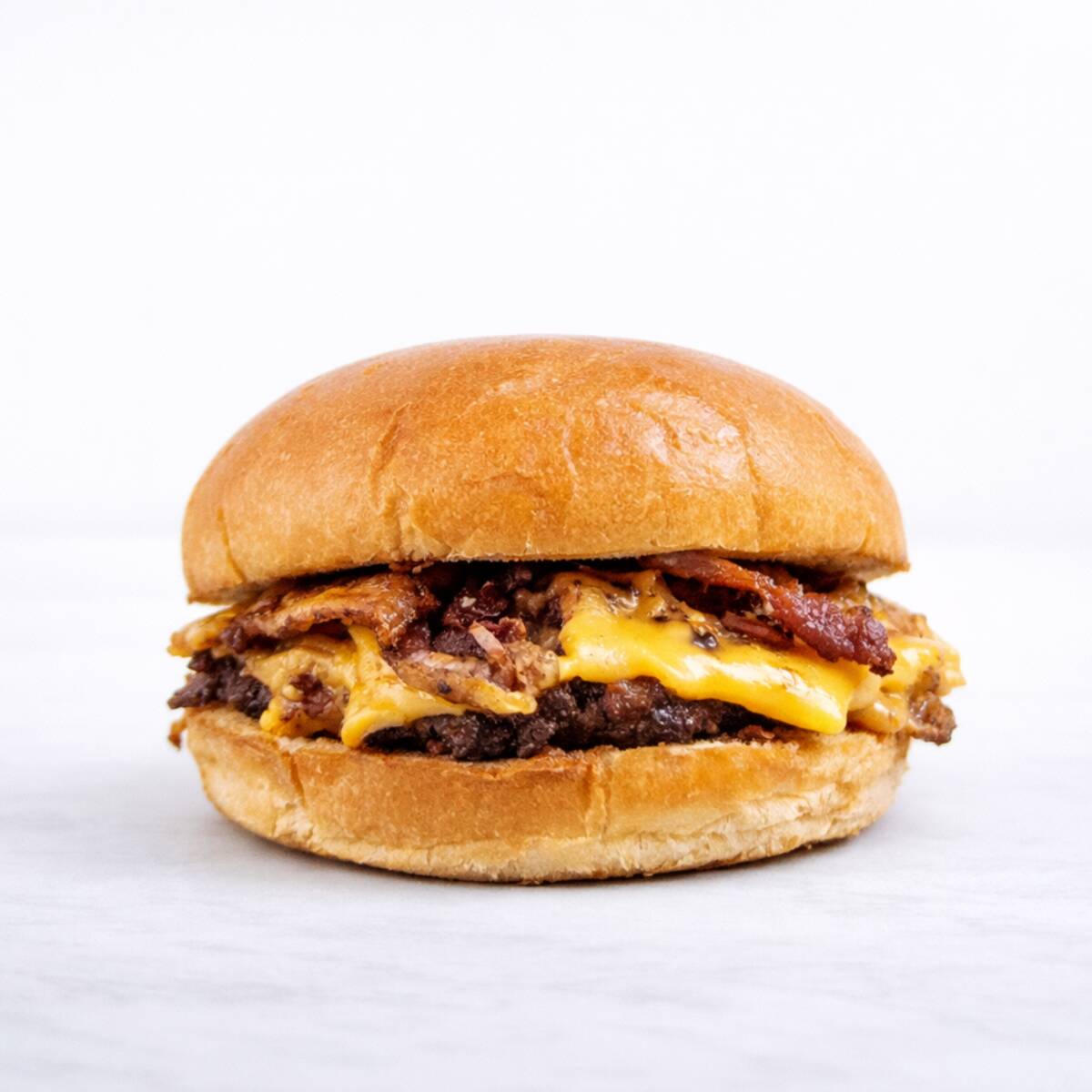 2 Carnes de 80 gr. c/u, doble queso amarillo y tocino, acompañado de 100 gr. de papas fritas