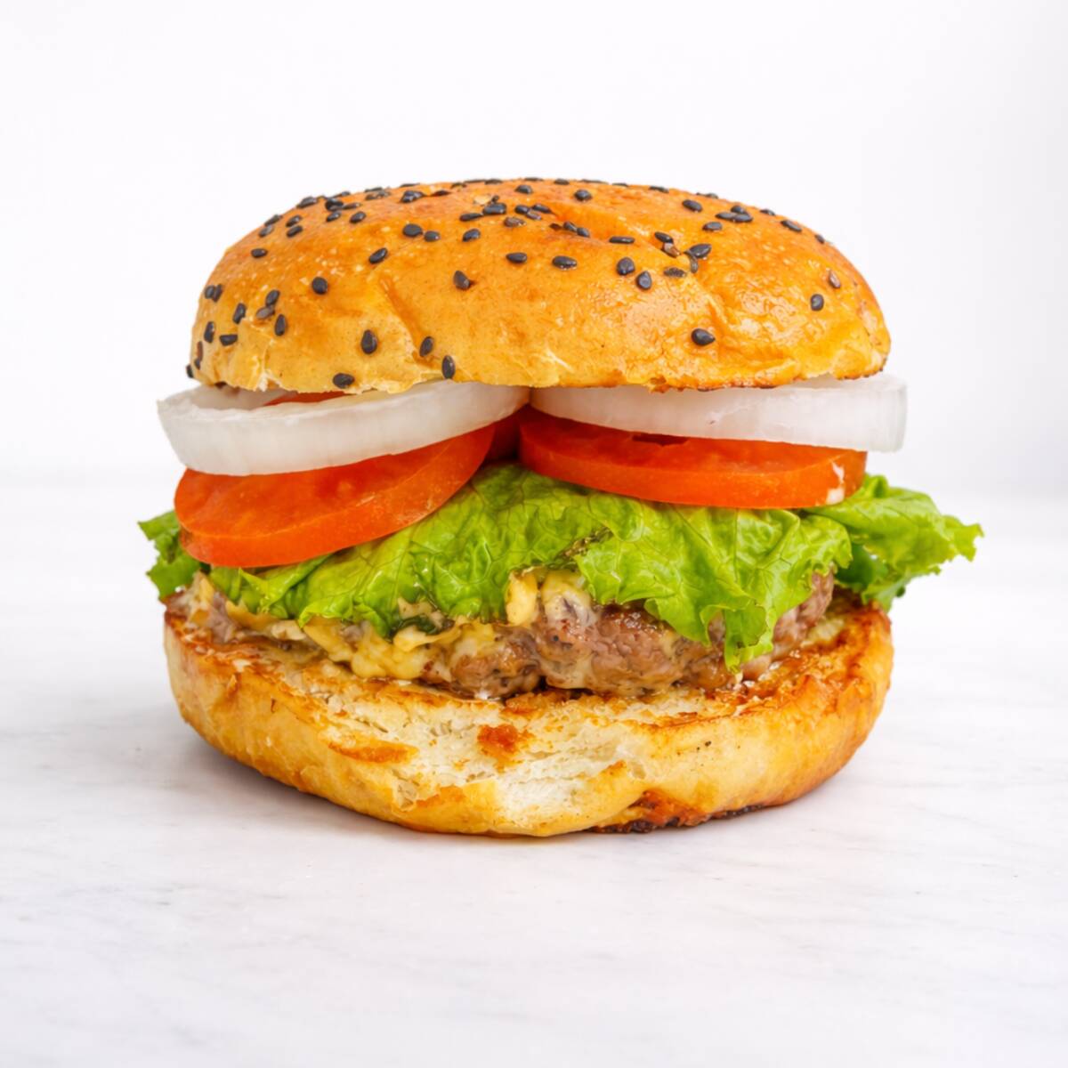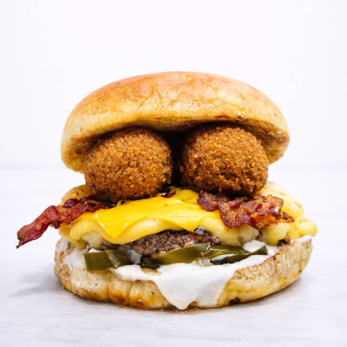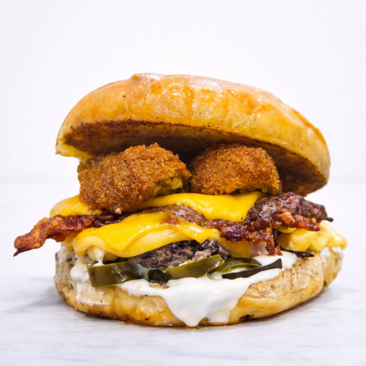 PAN BRIOCHE, CARNE DE 80GR. QUESO TIPO AMERICANO, JALAPEÑO POPPER, JALAPEÑOS, ADEREZO DE LA CASA, ACOMPAÑADA DE 100GR. DE PAPAS FRITAS
