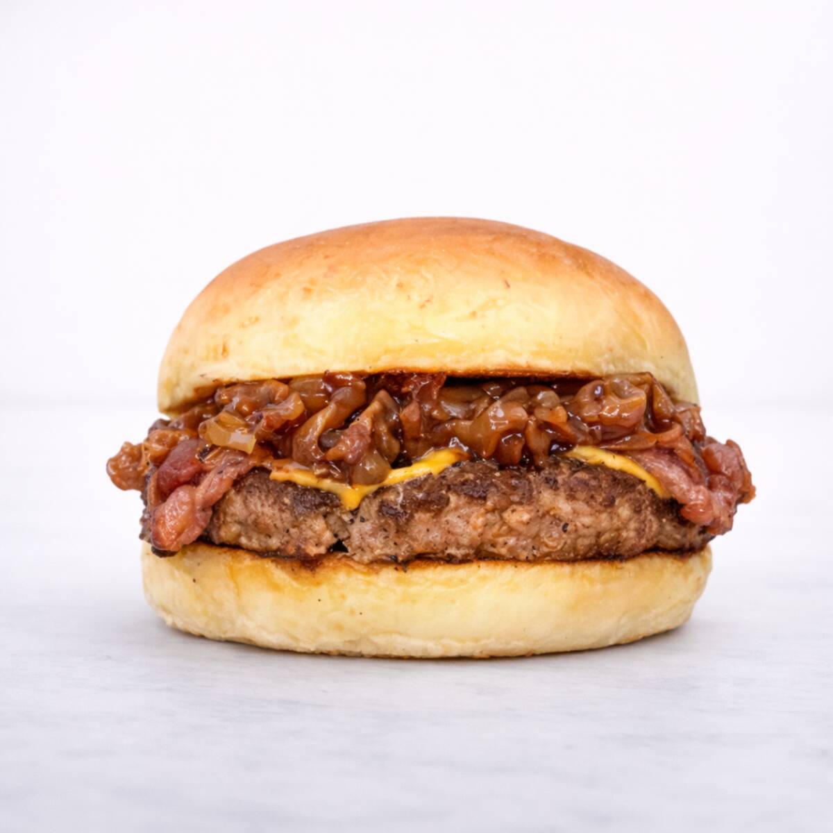 2 Carnes de 80 gr. c/u, doble queso, mermelada de tocino, acompañada de 100 gr. de papas fritas