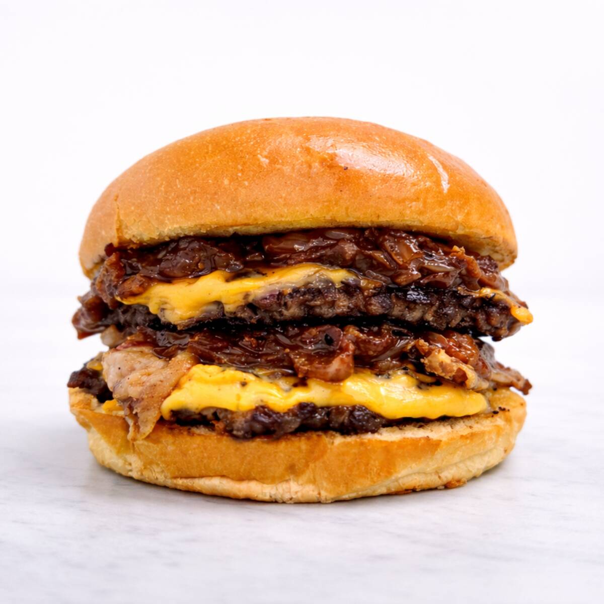 DOS COSTRAS DE CARNE DE 100gr. C/U, DOBLE QUESO, TOCINO, CEBOLLA ASADA, MAYONESA
