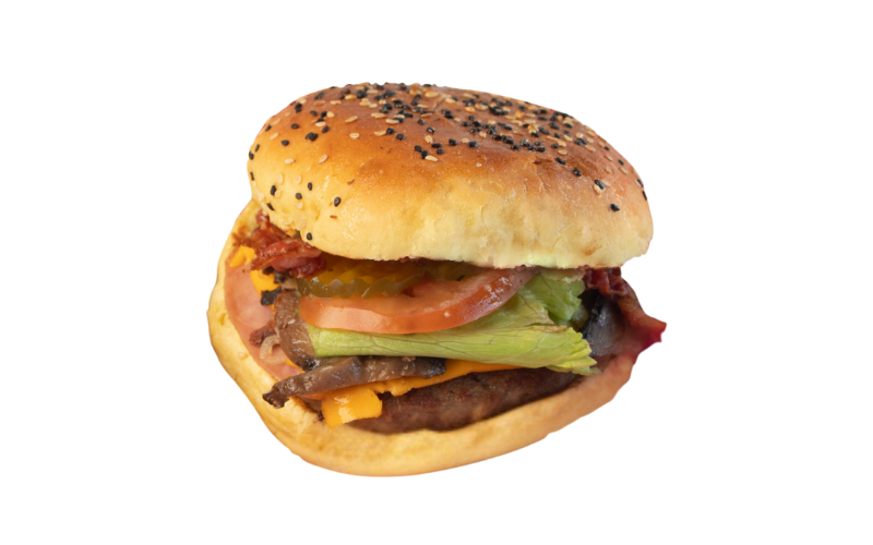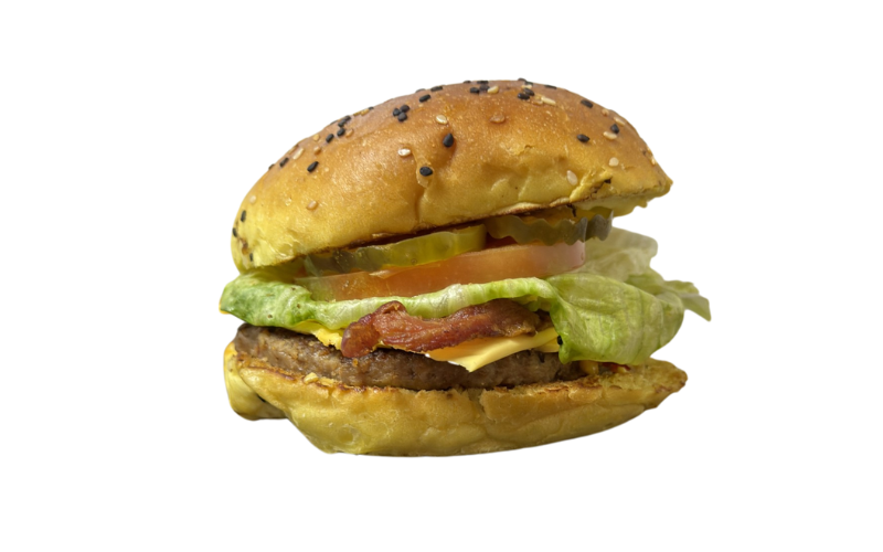 Carne de res, queso, tocino, cebolla asada, pepinillos, lechuga y tomate.