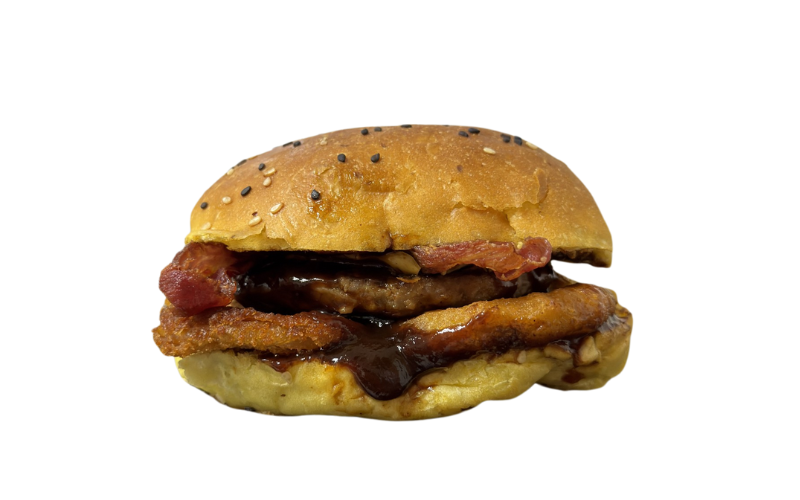 Carne de res, queso, tocino, aros de cebolla y salsa bbq.
