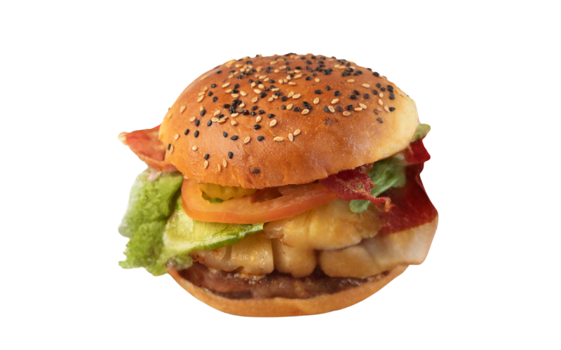 Carne de res, piña, queso, tocino, cebolla asada, lechuga pepinillos y tomate.