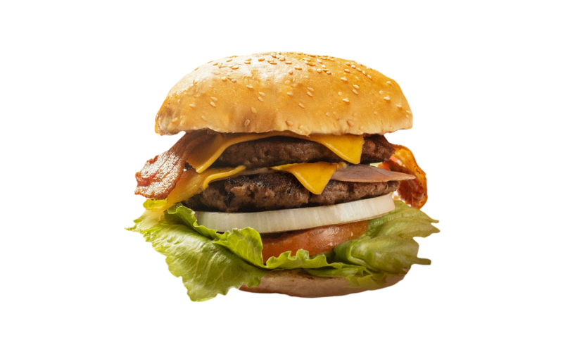 Doble carne de res, doble jamón, doble queso, doble tocino, lechuga, pepinillos, cebolla asada y tomate