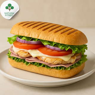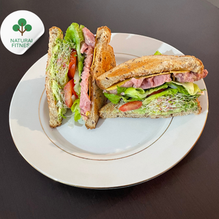 Doble jamón de pavo, germinado, queso, tomate, cebolla y aguacate.