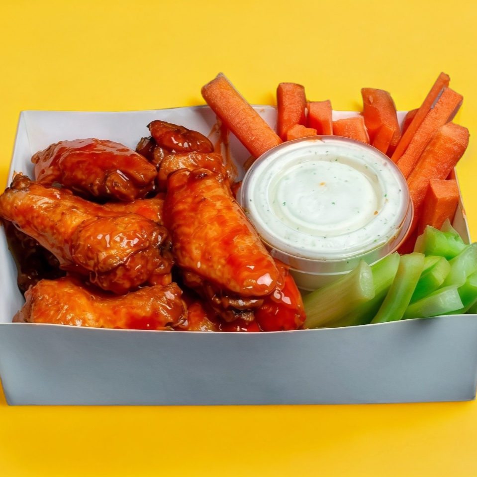 7 alitas o 250 gr. aprox, acompañados de apio, zanahoria, aderezo ranch y tu salsa favorita.