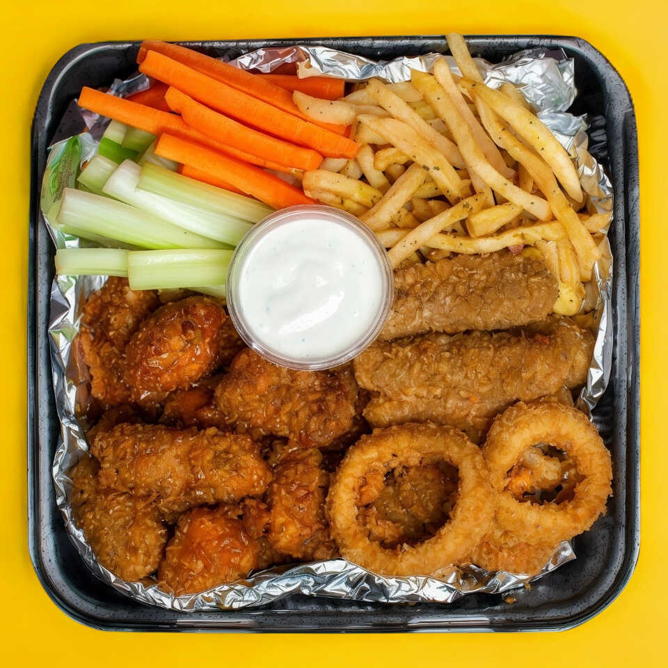 200 gr. De pechuga de pollo emapanizados, acompañados de zanahoria, apio, aros de cebolla, dedos de queso, papas francesas, con tu salsa favorita.