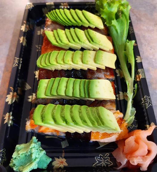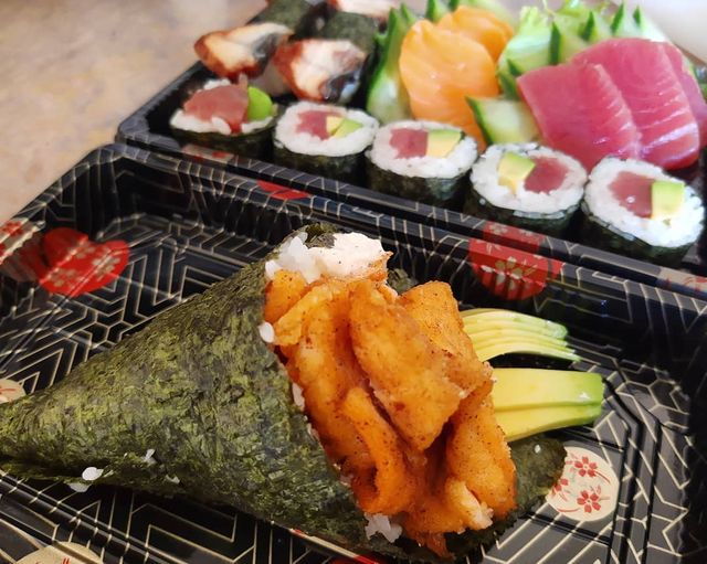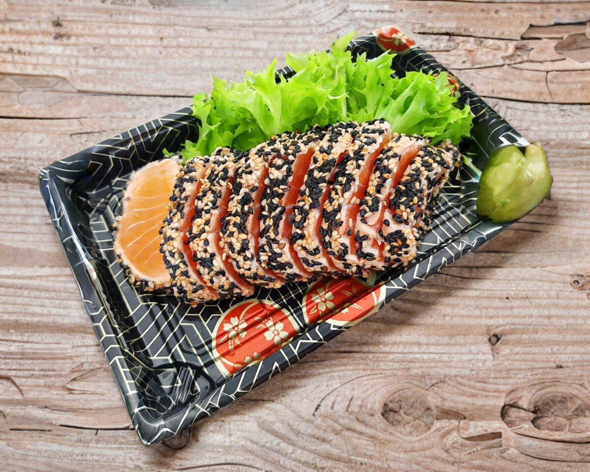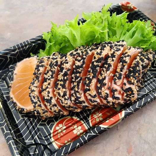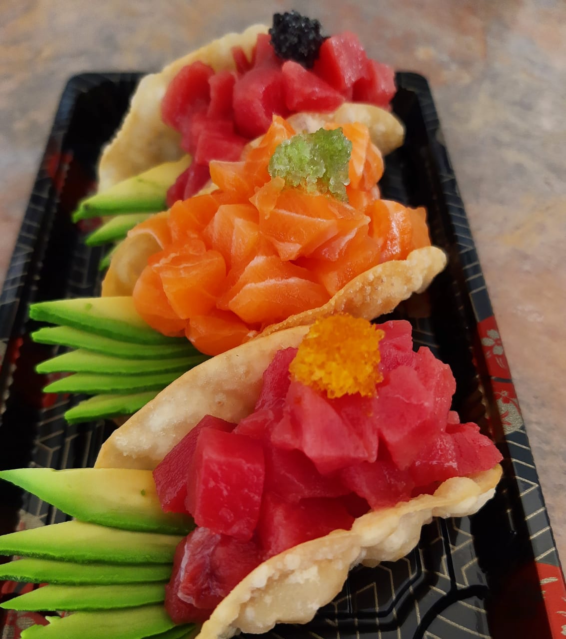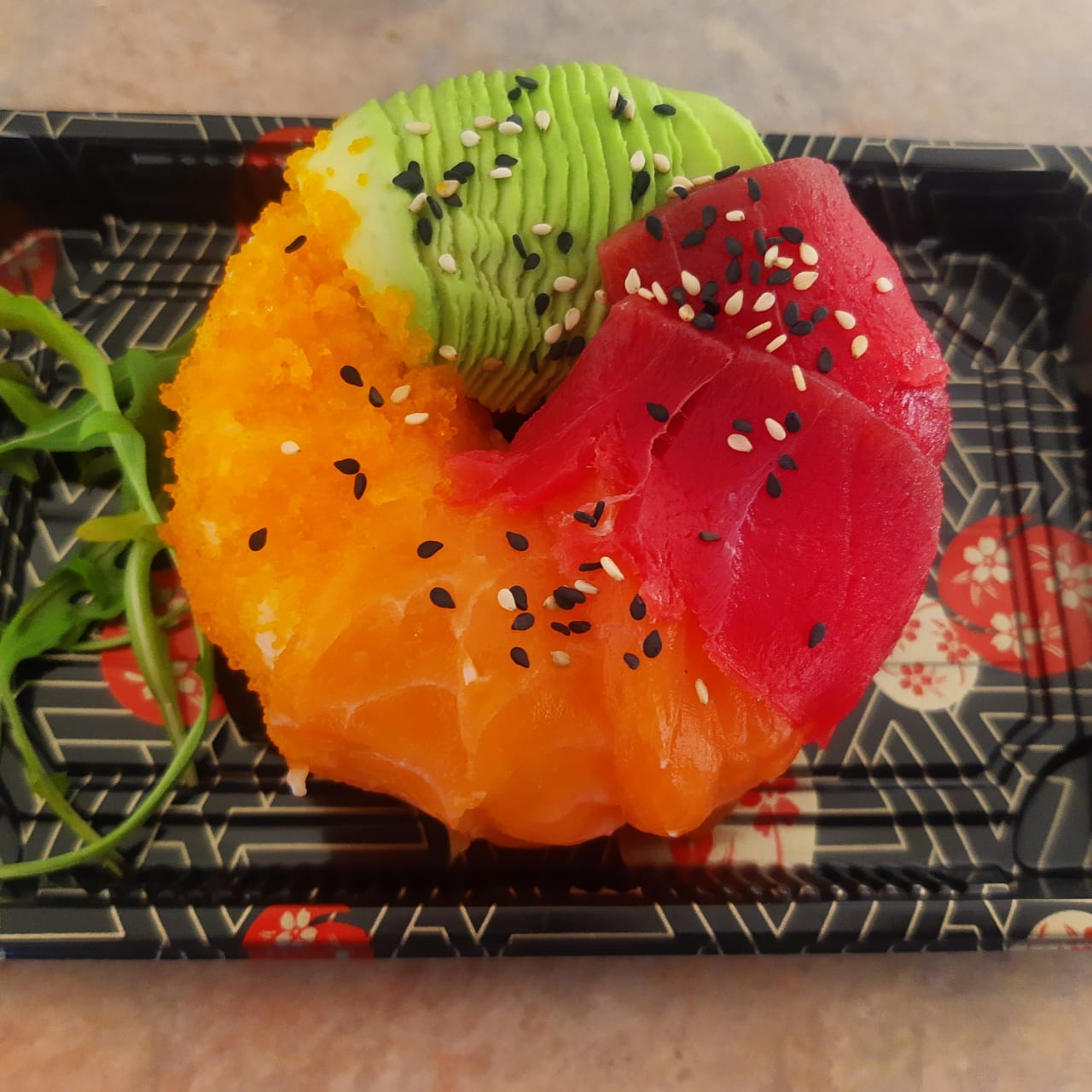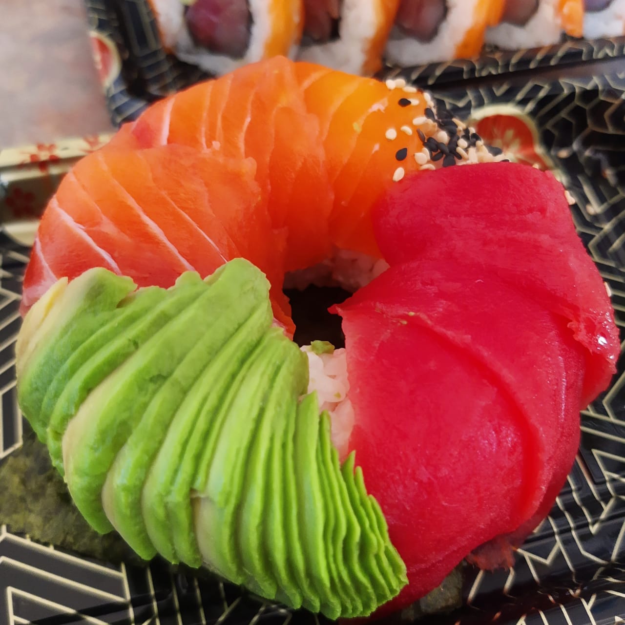 Cubierto de masago, salmón, atún, ajonjolí y aguacate.
