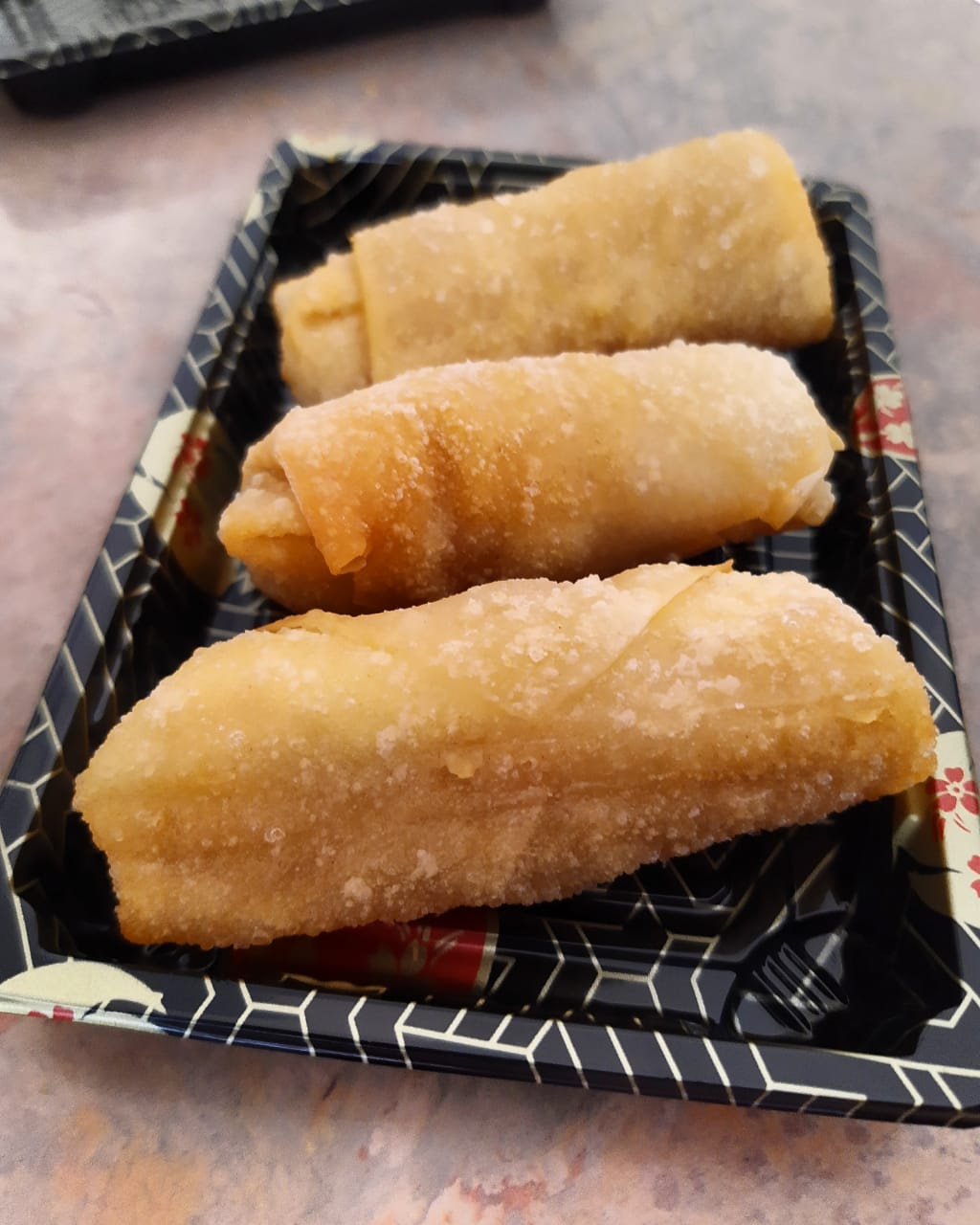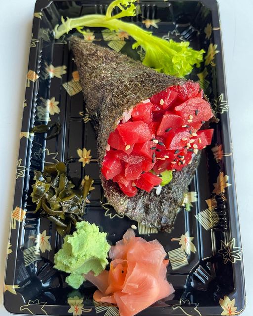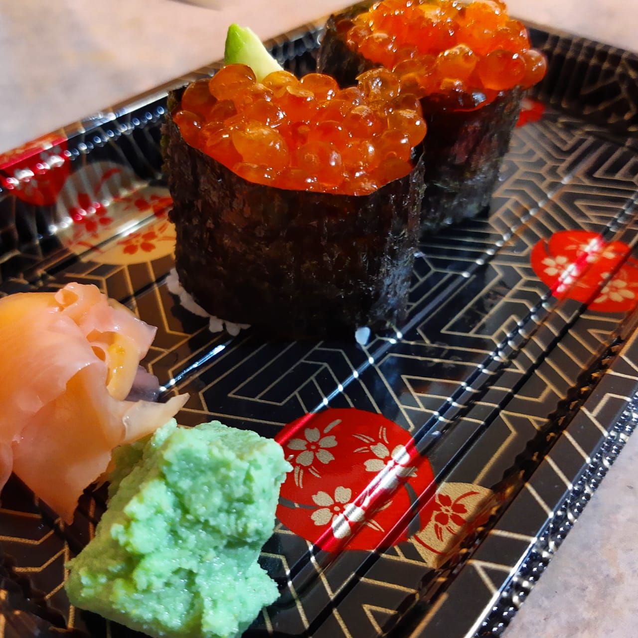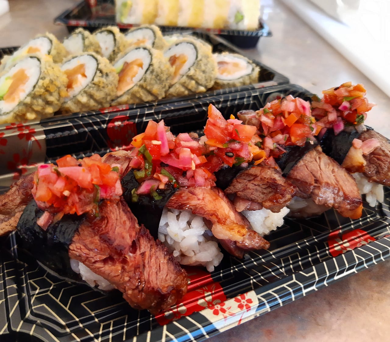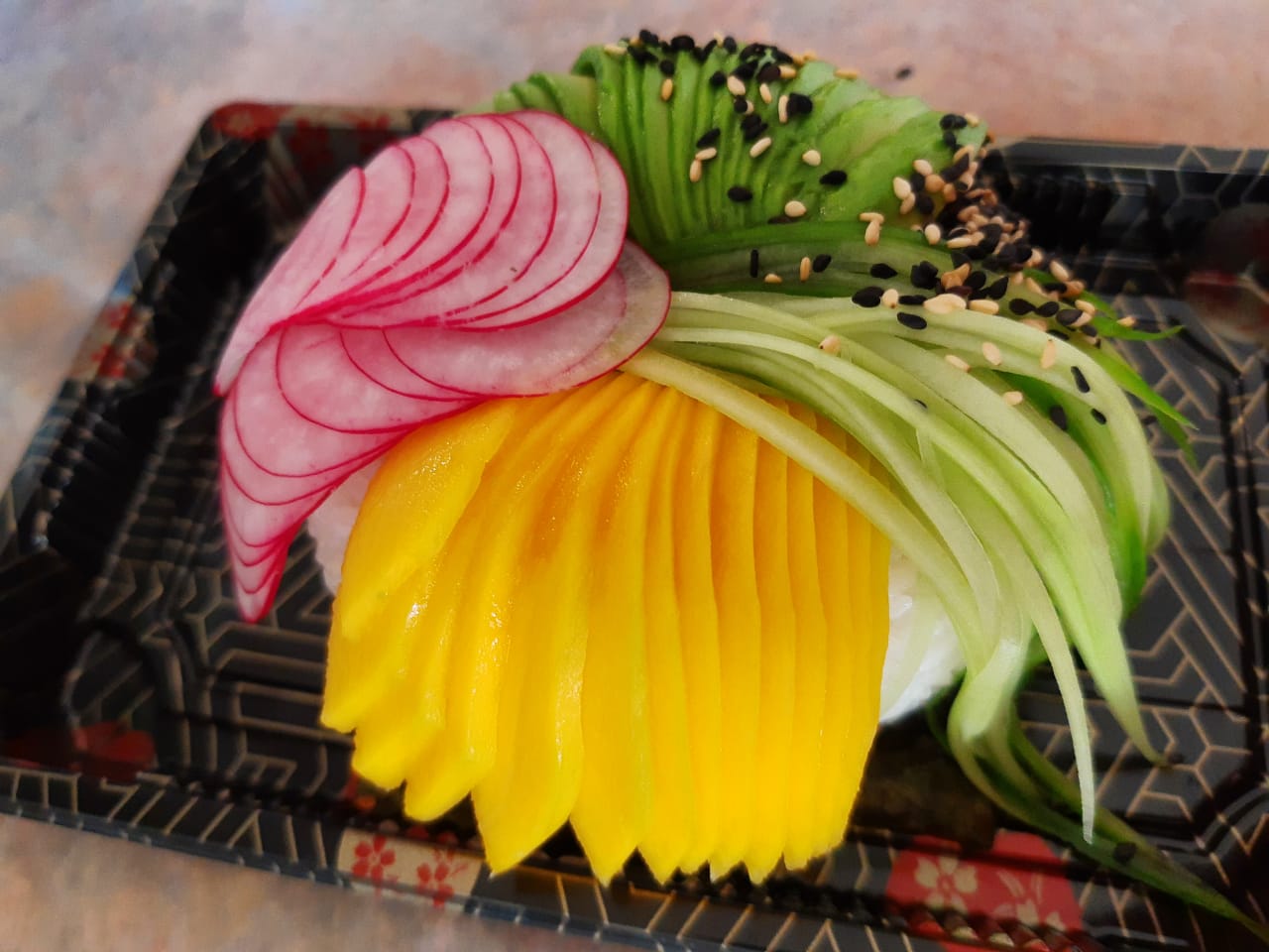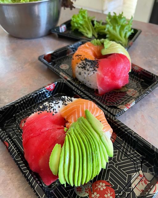 Cubierto de masago, salmón, atún, ajonjolí y aguacate.