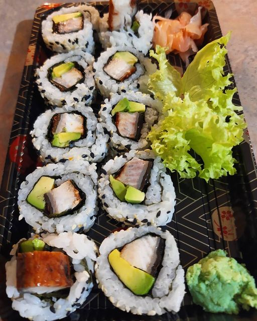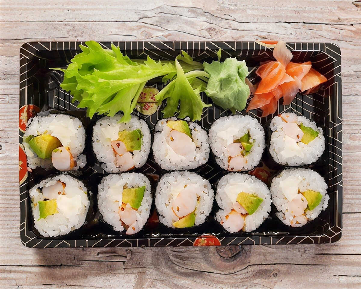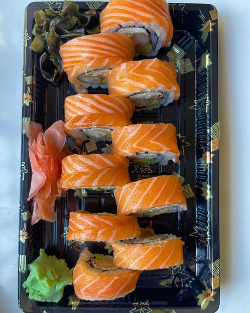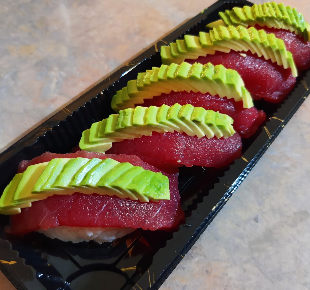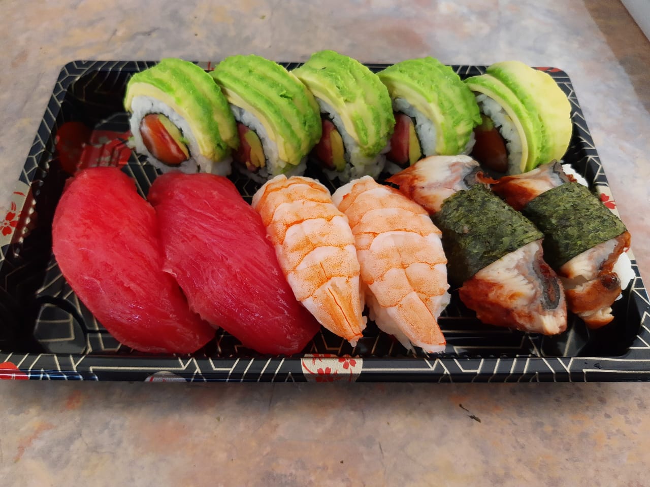 Con 5 unidades uramaki de salmón cubierto de aguacate, 2 de nigiri unagi, 2 nigiri de camarón y 2 nigiri de atún.