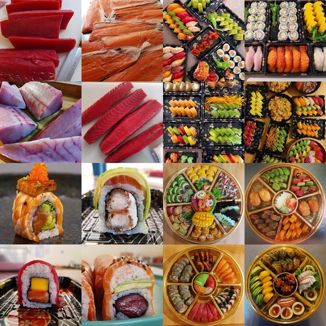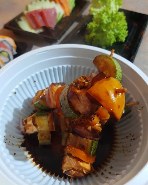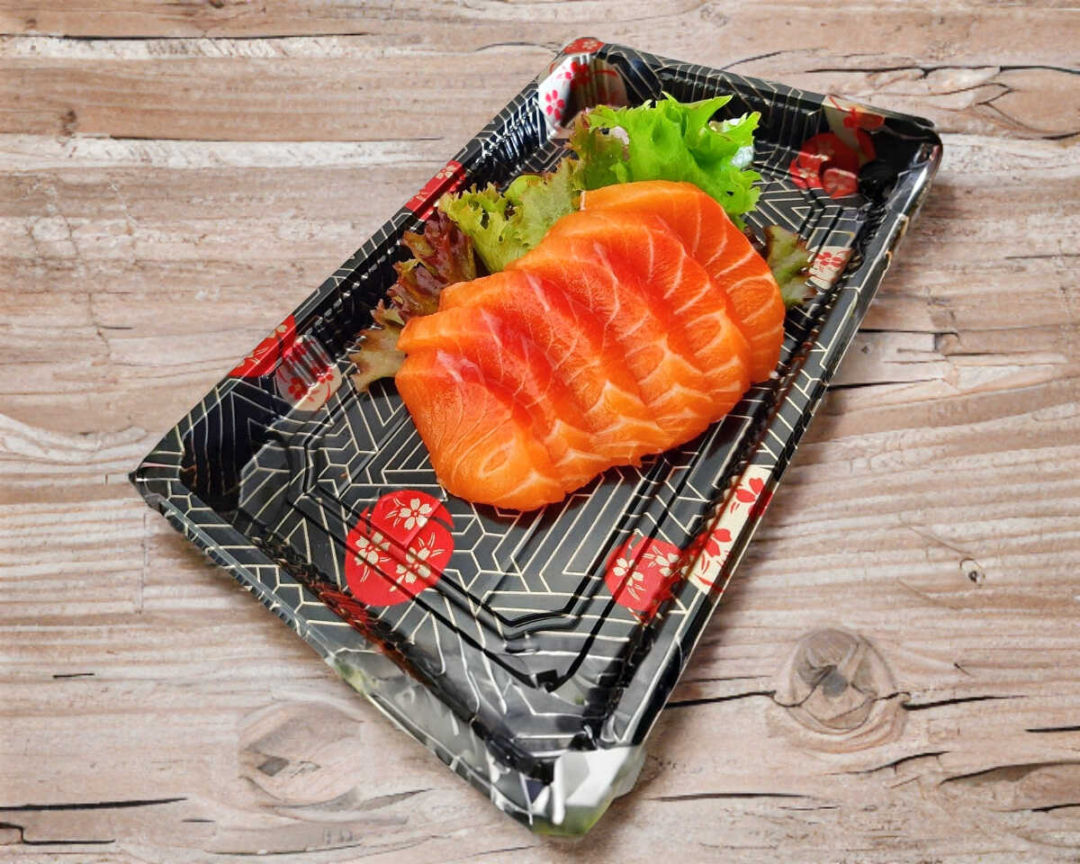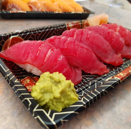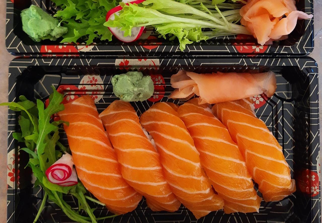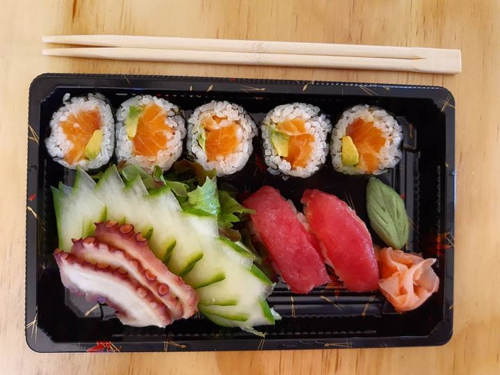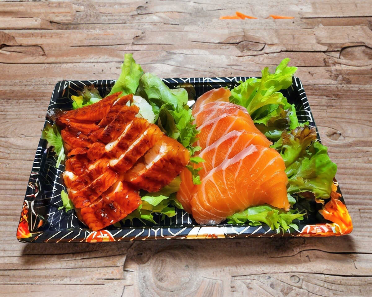 Con 3 de sashimi de salmón, 3 sashimi de atún, 2 nigiri de atún, 2 nigiri de salmón, 2 nigiri de salmón grillado.