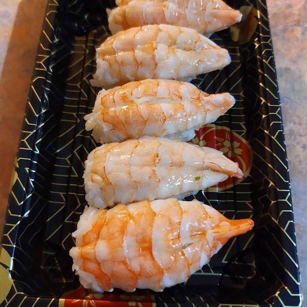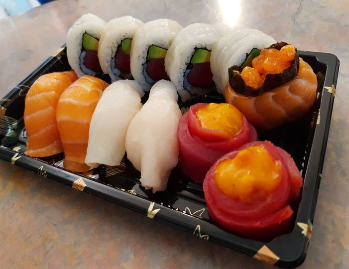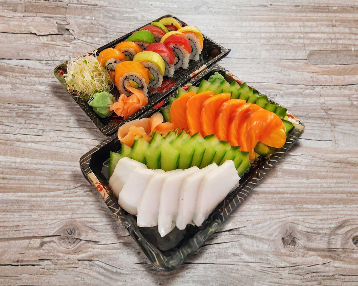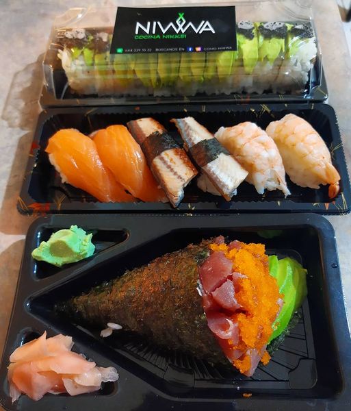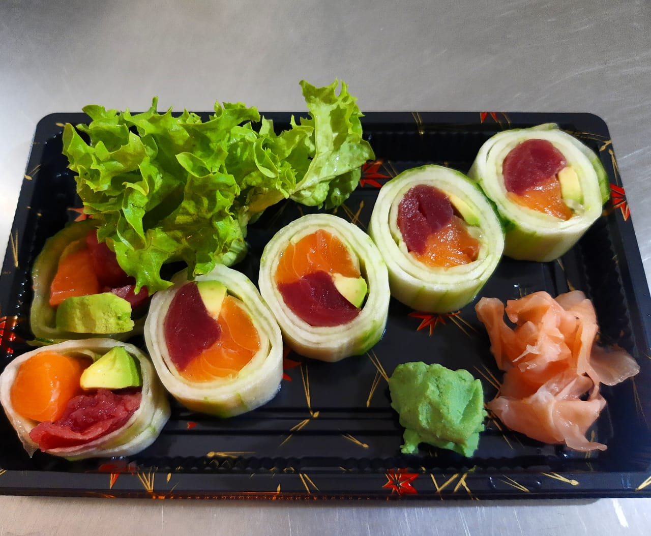 Con 2 nigiri de salmón, 2 nigiri de atún, 2 nigiri de camarón, 1/2 Uramaki de atun cubierto de aguacate, medio uramaki de camarón cubierto de salmón.