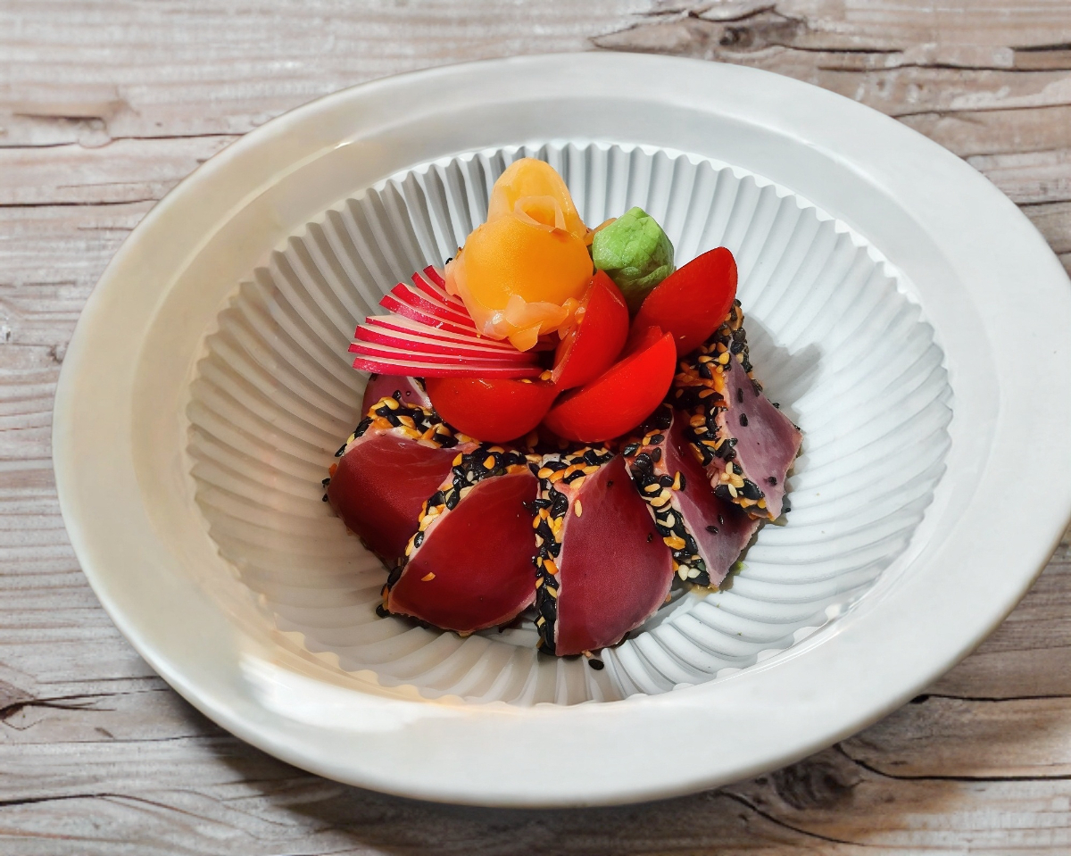 Rellena de Tampico cubierta con atún, aguacate, salmón y ajonjolí.