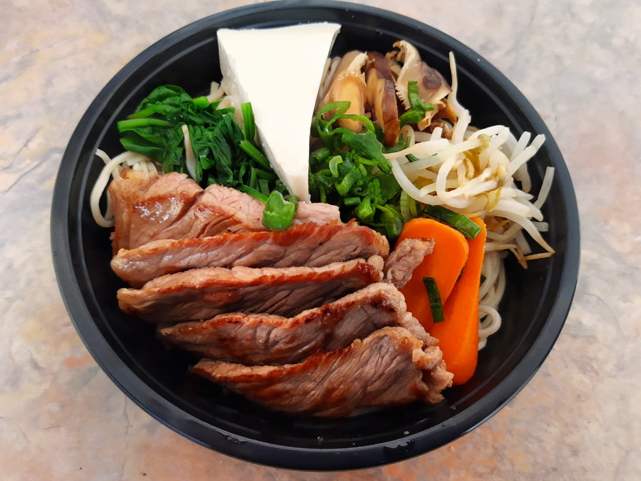 Pasta, tofu, espinaca, shitake, zanahoria, brote de soja, cebollín, huevo y proteína a elección.