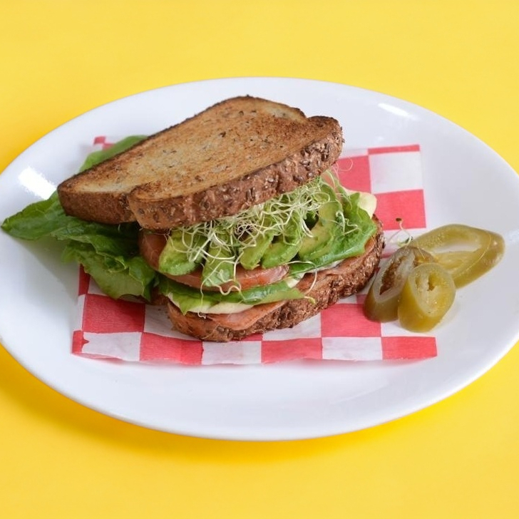 Pan integral, lechuga, atún con chipotle, tomate, aguacate, alfalfa.