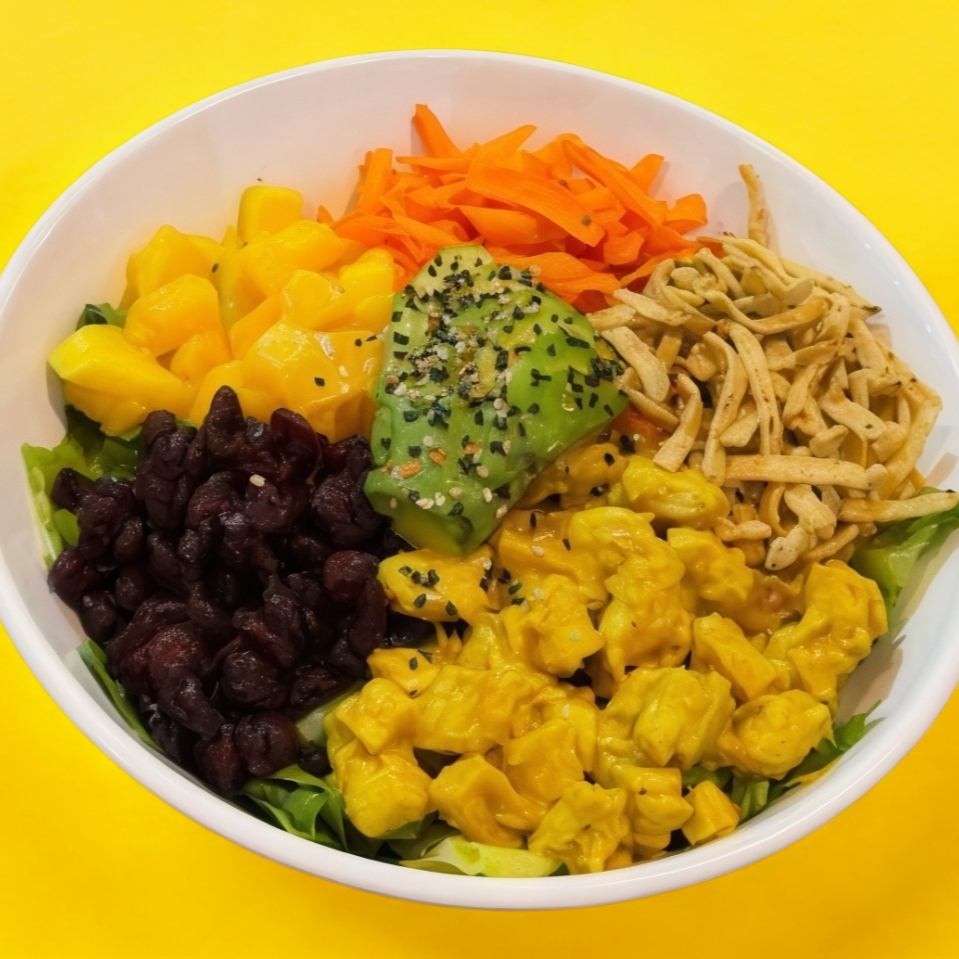 Refrescante, jugosa y llena de color. Base de lechuga orejona con pollo a la mostaza miel, combinada con mango, aguacate, zanahoria rallada y arándanos. 🌿🥭 Se complementa con aderezo de frutos rojos y tiras de maíz crujientes para una experiencia deliciosa. 🌈🥗