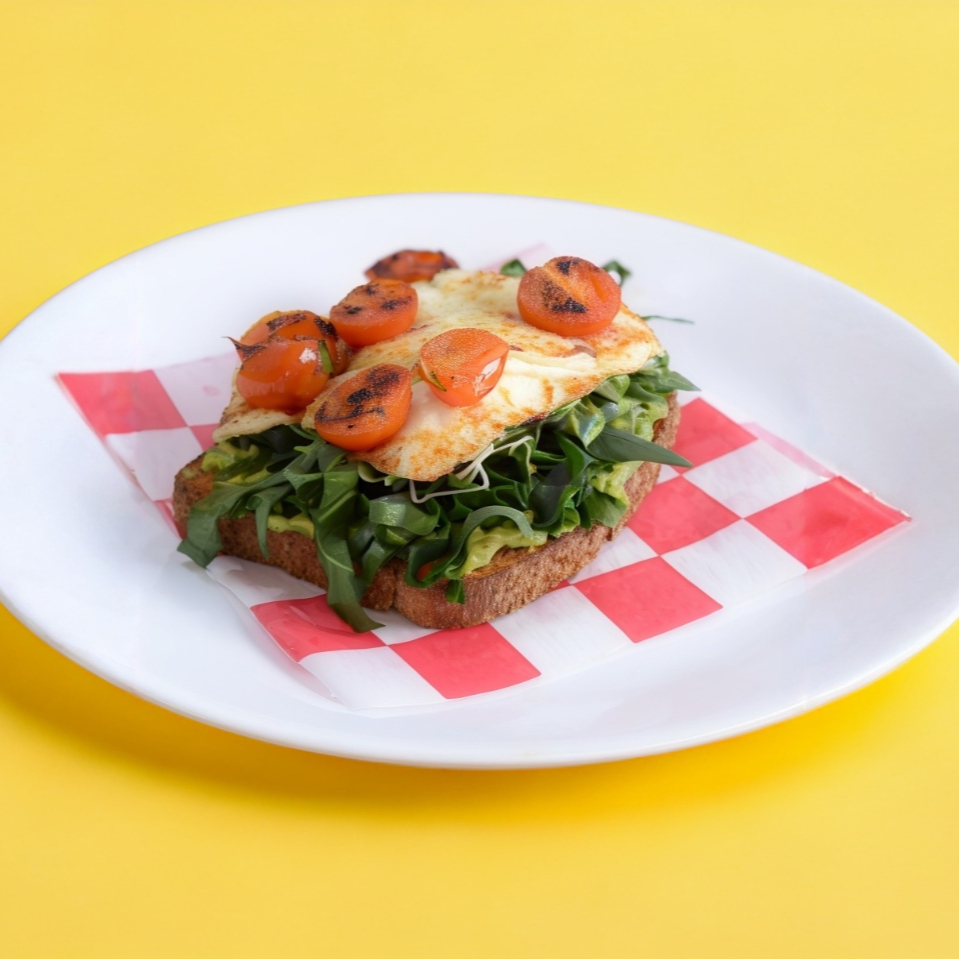 Pan integral tostado con aguacate,espinaca, huevo a tu elección (estrellado o revuelto), tomate cherry salteado.