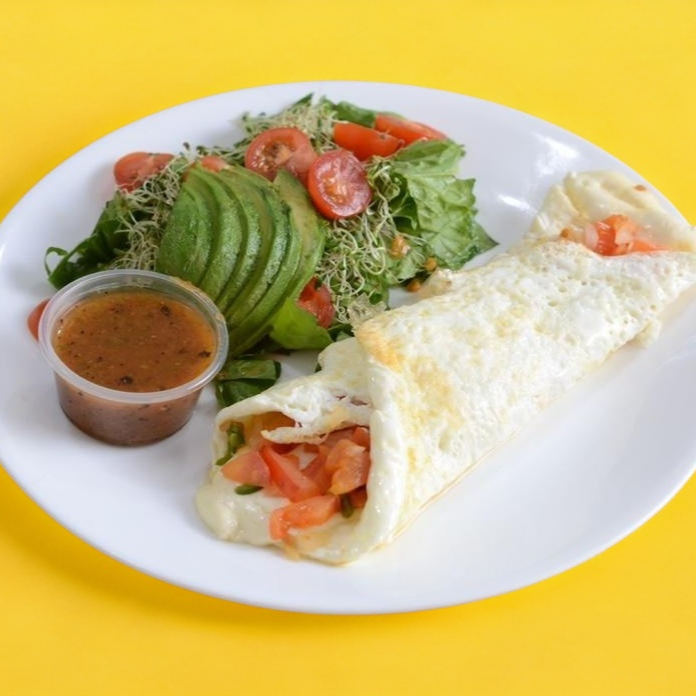 Omellete de claras de huevo, relleno de salsa bandera, queso panela, Acompañado de ensalada, salsa y 1 pza de pan integral tostado.