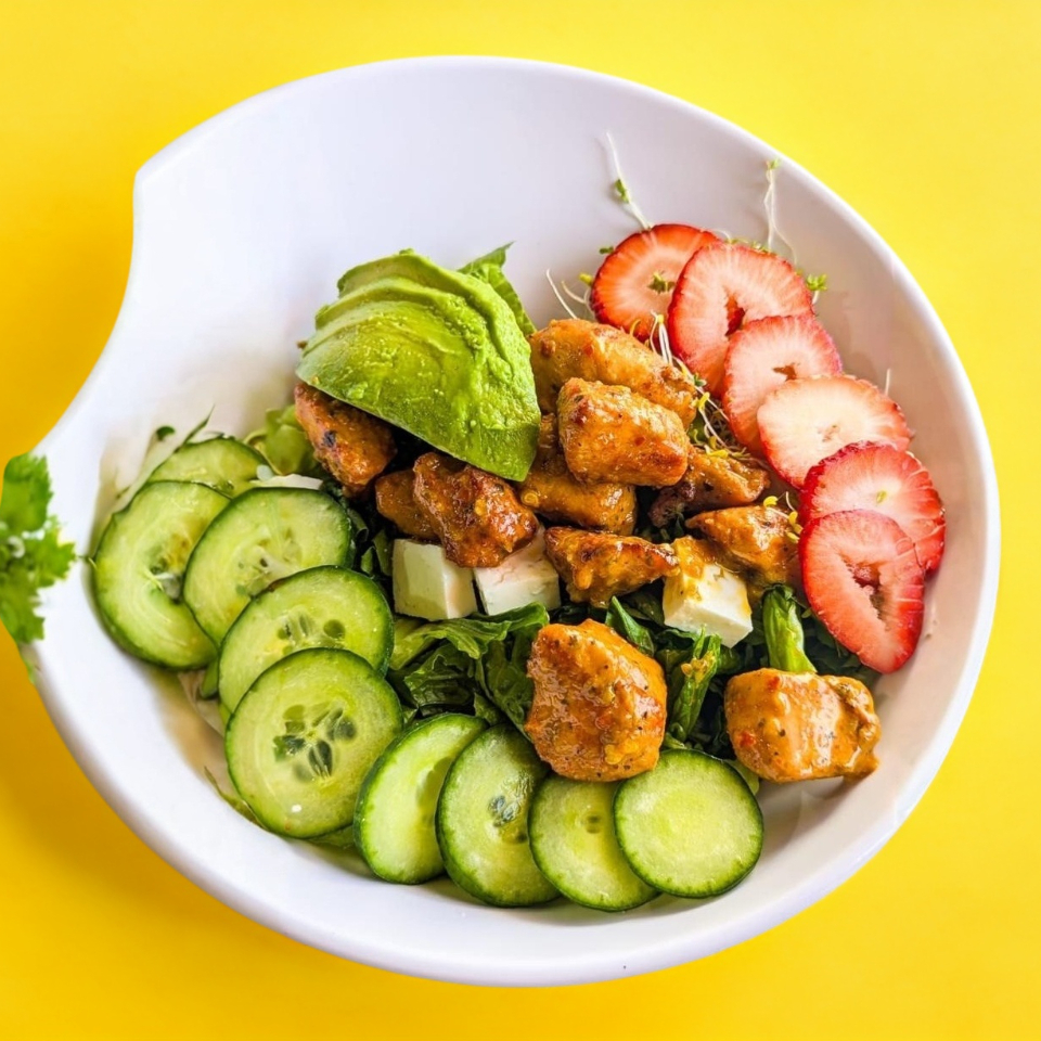 Ensalada de pechuga de pollo a la mostaza miel, con base de lechuga orejona, pepino, tomate cherry, alfalfa, fresa, manzana verde y queso panela. Acompañada de crutones y aderezo chipotle.