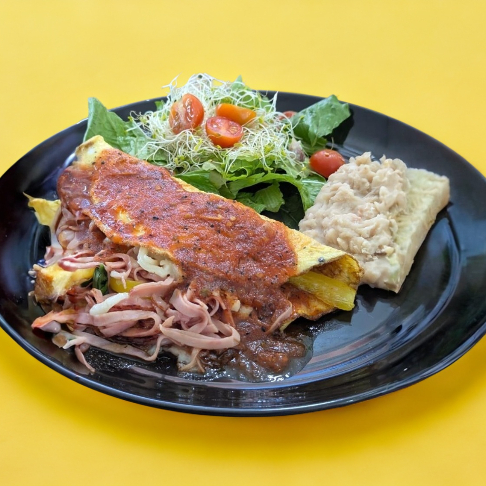 Omellete de 2 huevos relleno de pimiento, espinaca, queso Oaxaca, jamón, Acompañado de ensalada, frijol, salsa y 1 pza de pan integral tostado.