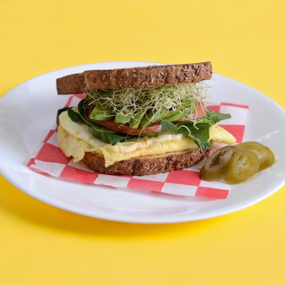 Pan integral , huevo en torta, queso panela asado, espinaca, tomate, alfalfa, aguacate.